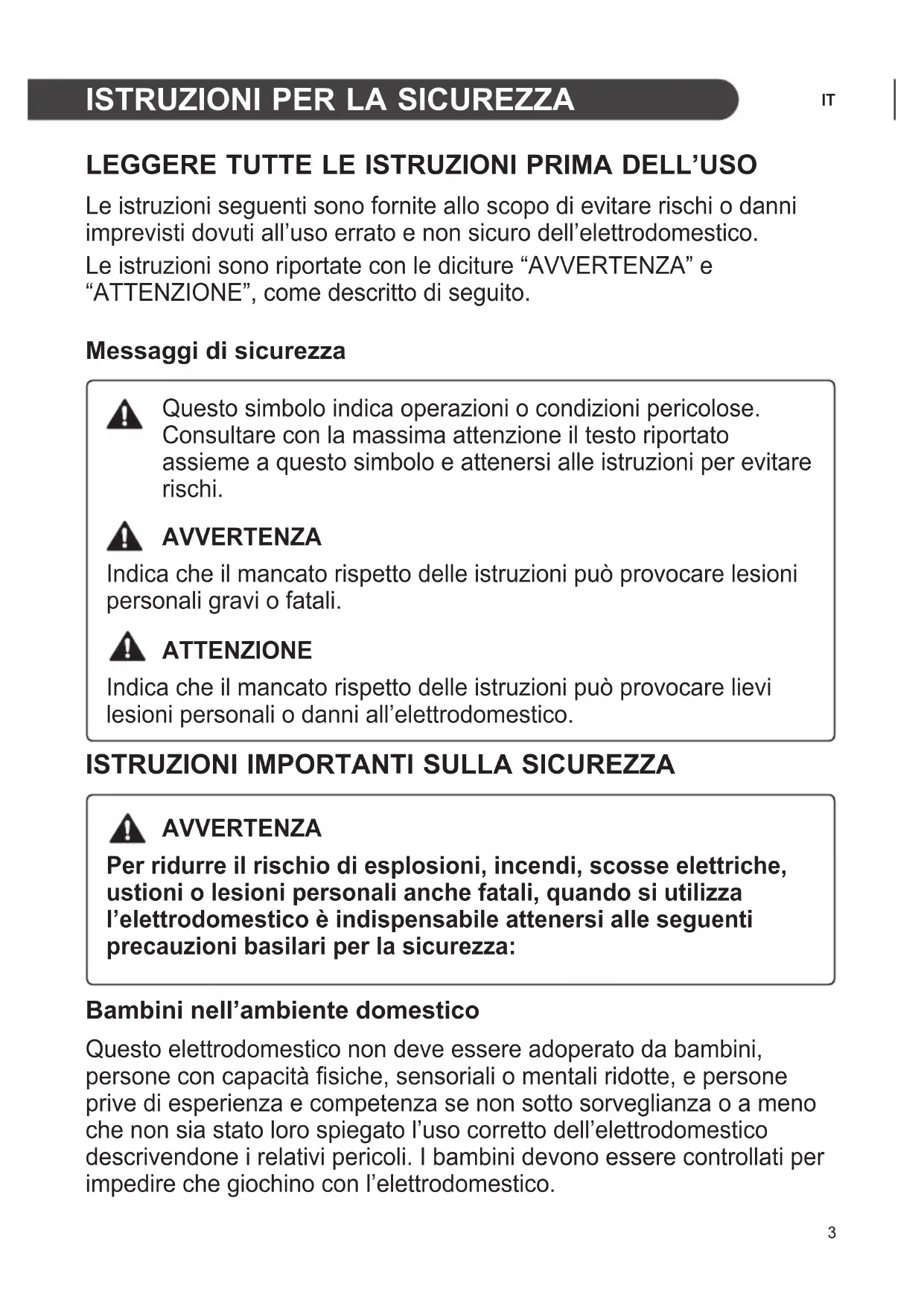 LEGGERE TUTTE LE ISTRUZIONI PRIMA DELL’USO Le istruzioni seguenti sono fornite allo scopo di evitare rischi o danni imprevisti dovuti all’uso errato e non sicuro dell’elettrodomestico. Le istruzioni sono riportate con le diciture “AVVERTENZA” e “ATTENZIONE”, come descritto di seguito. Messaggi di sicurezza Questo simbolo indica operazioni o condizioni pericolose. Consultare con la massima attenzione il testo riportato assieme a questo simbolo e attenersi alle istruzioni per evitare rischi. AVVERTENZA Indica che il mancato rispetto delle istruzioni può provocare lesioni personali gravi o fatali. ATTENZIONE Indica che il mancato rispetto delle istruzioni può provocare lievi lesioni personali o danni all’elettrodomestico.