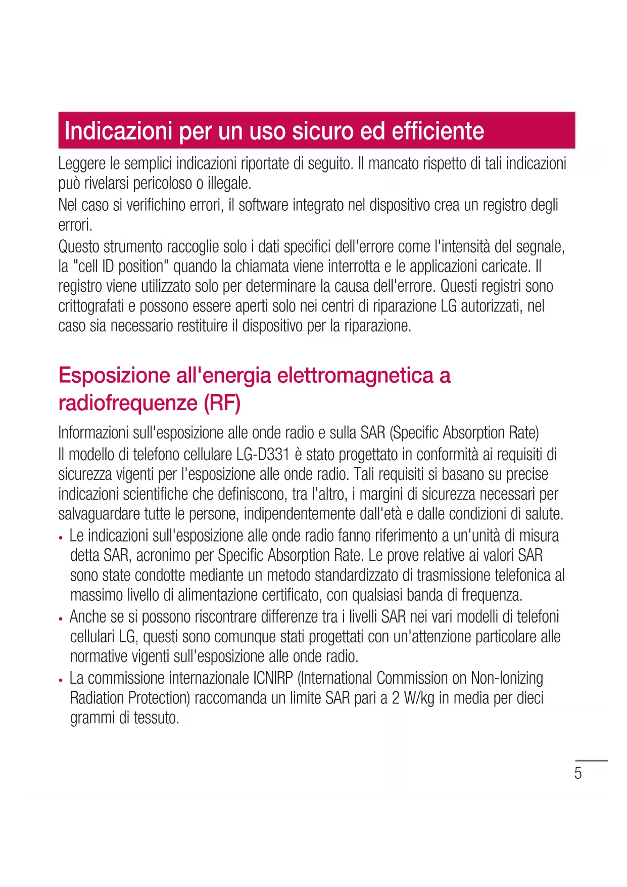 - La commissione internazionale ICNIRP (International Commission on Non-Ionizing Radiation Protection) raccomanda un limite SAR pari a 2 W/kg in media per dieci grammi di tessuto. Indicazioni per un uso sicuro ed efficiente6