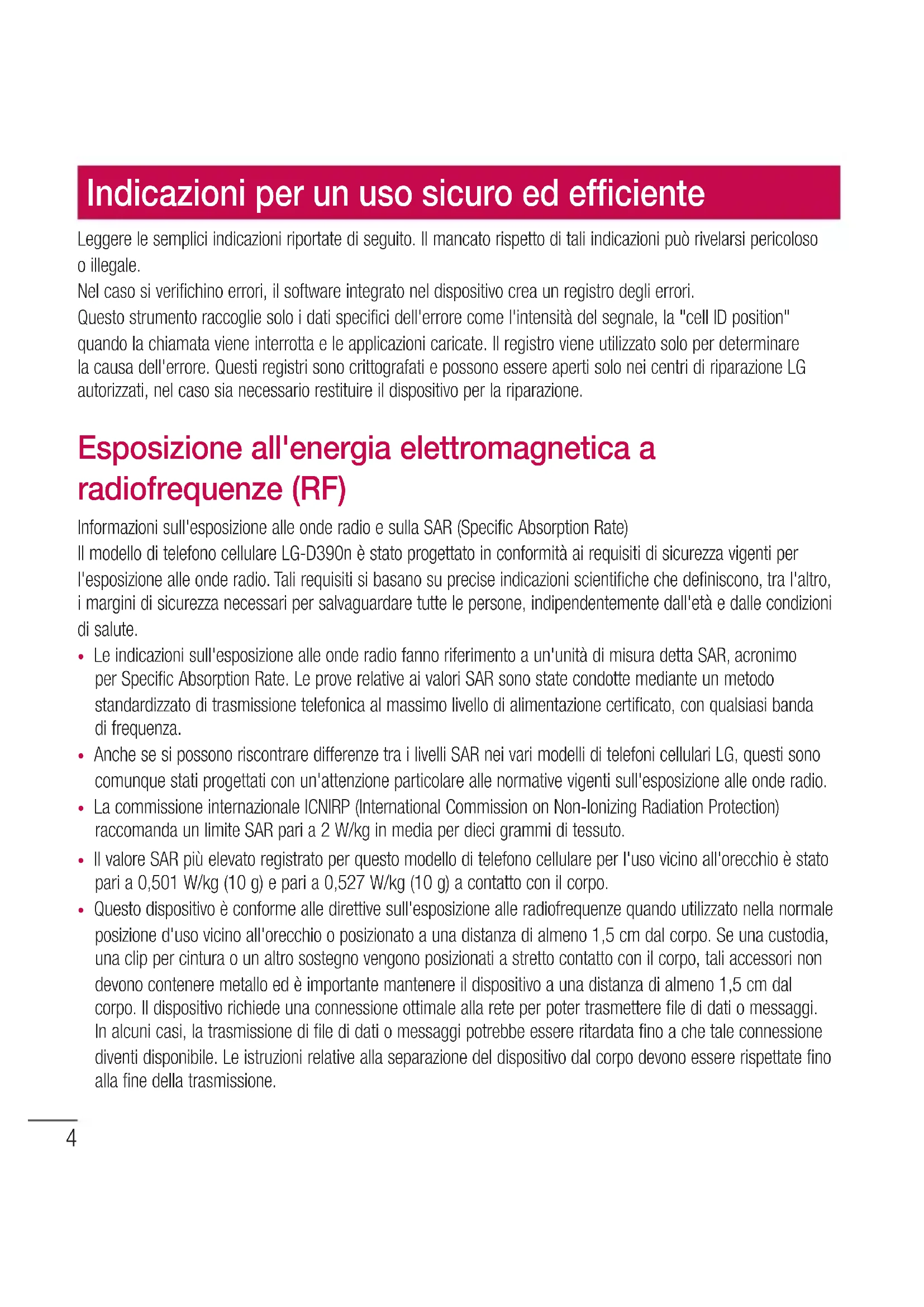 - Google™, Google Maps™, Gmail™, YouTube™, Hangouts™ e Play Store™ sono marchi registrati di Google, Inc. ITALIANO2 Sommario Indicazioni per un uso sicuro ed efficiente .......4 Avviso importante .............................................11 Introduzione al telefono ...................................16 Panoramicadeltelefono..................................16 InstallazionedellaschedaSIMedellabatteria. 18 Ricaricadeltelefono........................................20 Utilizzodellaschedadimemoria.....................21 Bloccoesbloccodelloschermo.......................22 Schermata principale .......................................23 Suggerimentiperloschermoasoramento....23 Sfondo............................................................24 Schermata home estesa ................................24 Personalizzazione della schermata iniziale ......25 Ritornoalleapplicazioniutilizzatedirecente....26 Areadellenotiche.........................................26 Apertura dell'area delle notifiche ....................27 Icone degli indicatori sulla barra di stato .........27 Tastierasulloschermo....................................29 Immissione di lettere accentate......................29 Configurazione di un account Google ..............30 Connessione a reti e dispositivi .......................31 Wi-Fi...............................................................31 Connessione alle reti Wi-Fi ............................31 Attivazione della funzione Wi-Fi e connessione a una rete Wi-Fi ............................................31 Bluetooth........................................................32 Condivisionedellaconnessionedatidel telefono...........................................................33 Wi-FiDirect.....................................................34 CollegamentoalPCtramitecavoUSB..............35 Chiamate ...........................................................36 Pereffettuareunachiamata............................36 Comechiamareicontatti................................36 Ricezioneeriutodiunachiamata..................36 Regolazionedelvolumedichiamata................36 Pereffettuareunasecondachiamata..............37 Visualizzazionedellacronologiachiamate.......37 Impostazionichiamate....................................37 Rubrica ..............................................................38 Ricercadiuncontatto.....................................38 Aggiuntadiunnuovocontatto.........................38 Contattipreferiti..............................................38 Creazionediungruppo...................................39 Messaggi ...........................................................40 Inviodiunmessaggio......................................40 Casellastrutturata..........................................41 Modicadelleimpostazioniperimessaggi.....41 Email .................................................................42 Gestionediunaccounte-mail.........................42 AttivitàconlecartelleAccount.........................42 Composizioneeinviodie-mail........................43 Fotocamera e Video ..........................................44 Introduzionealmirino......................................44 Usodelleimpostazioniavanzate......................45 Perscattareunafoto......................................45 Dopoaverescattatounafoto...........................46 Scattomovimenti............................................47 UtilizzodellamodalitàPanorama....................47 Registrazionerapidadiunvideo......................47 OperazioniinmodalitàGalleria........................483 Funzione ............................................................49 KnockCode.....................................................49 TocToc............................................................49 Tastieraintelligente.........................................50 Utilità .................................................................51 Impostazionedellasveglia...............................51 AggiuntadiuneventoalCalendario................51 Google+..........................................................51 Ricercavocale.................................................52 Download........................................................52 Il Web ................................................................53 Chrome...........................................................53 Visualizzazione delle pagine Web ...................53 Apertura di una pagina ..................................53 Impostazioni .....................................................54 RETIWIRELESS...............................................54 DISPOSITIVO...................................................56 PERSONALE....................................................59 SISTEMA.........................................................60 Aggiornamento software del telefono .............62 Aggiornamentosoftwaredeltelefono..............62 Informazioni su questa guida per l'utente ......63 Informazionisuquestaguidaperl'utente........63 Marchiregistrati..............................................63 Accessori ..........................................................64 Risoluzione dei problemi ..................................65 DOMANDE FREQUENTI ......................................694 Leggere le semplici indicazioni riportate di seguito. Il mancato rispetto di tali indicazioni può rivelarsi pericoloso o illegale. Nel caso si verifichino errori, il software integrato nel dispositivo crea un registro degli errori. Questo strumento raccoglie solo i dati specifici dell'errore come l'intensità del segnale, la "cell ID position" quando la chiamata viene interrotta e le applicazioni caricate. Il registro viene utilizzato solo per determinare la causa dell'errore. Questi registri sono crittografati e possono essere aperti solo nei centri di riparazione LG autorizzati, nel caso sia necessario restituire il dispositivo per la riparazione. Esposizione all'energia elettromagnetica a radiofrequenze (RF) I