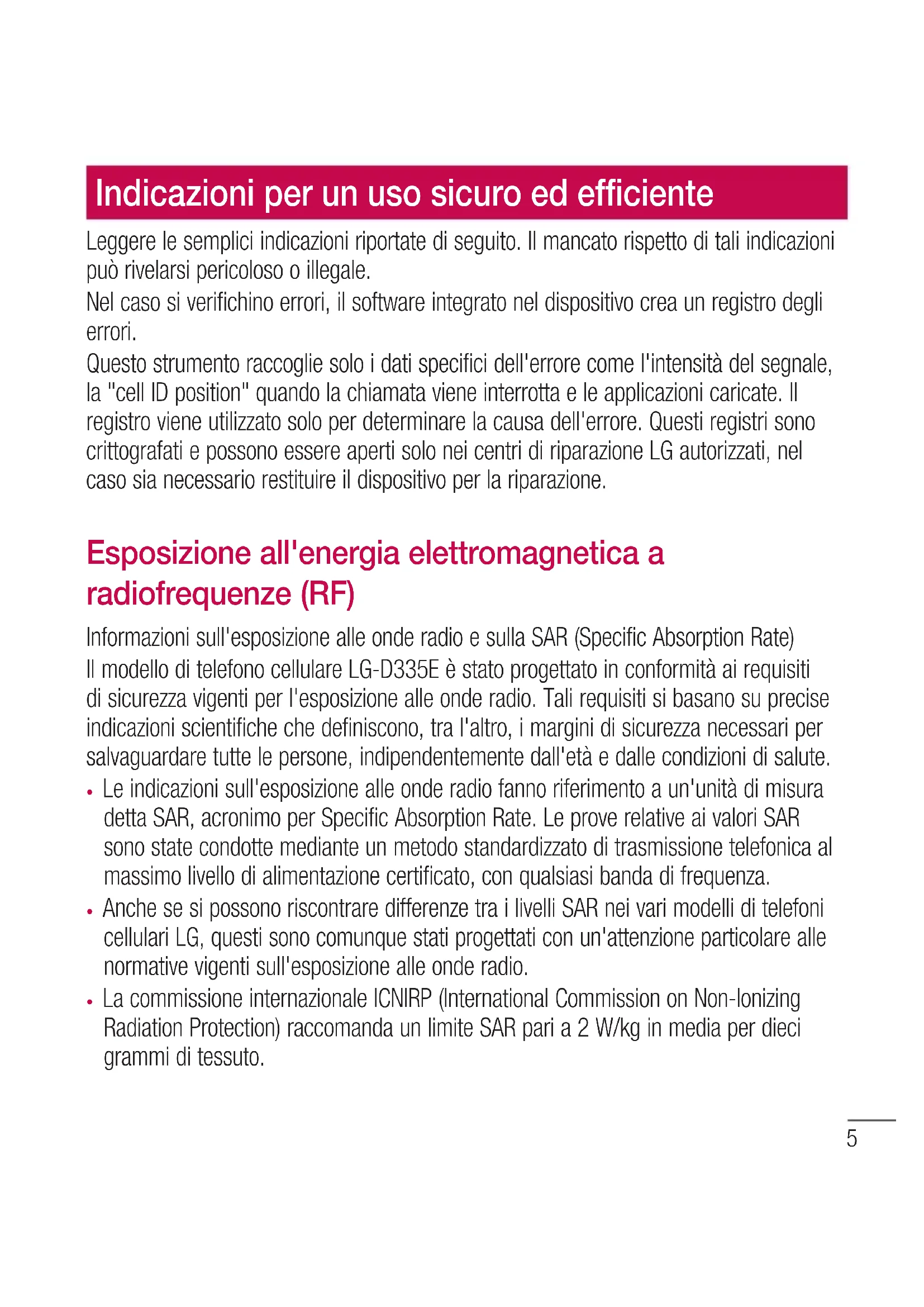 - Anche se si possono riscontrare differenze tra i livelli SAR nei vari modelli di telefoni cellulari LG, questi sono comunque stati progettati con un'attenzione particolare alle normative vigenti sull'esposizione alle onde radio.