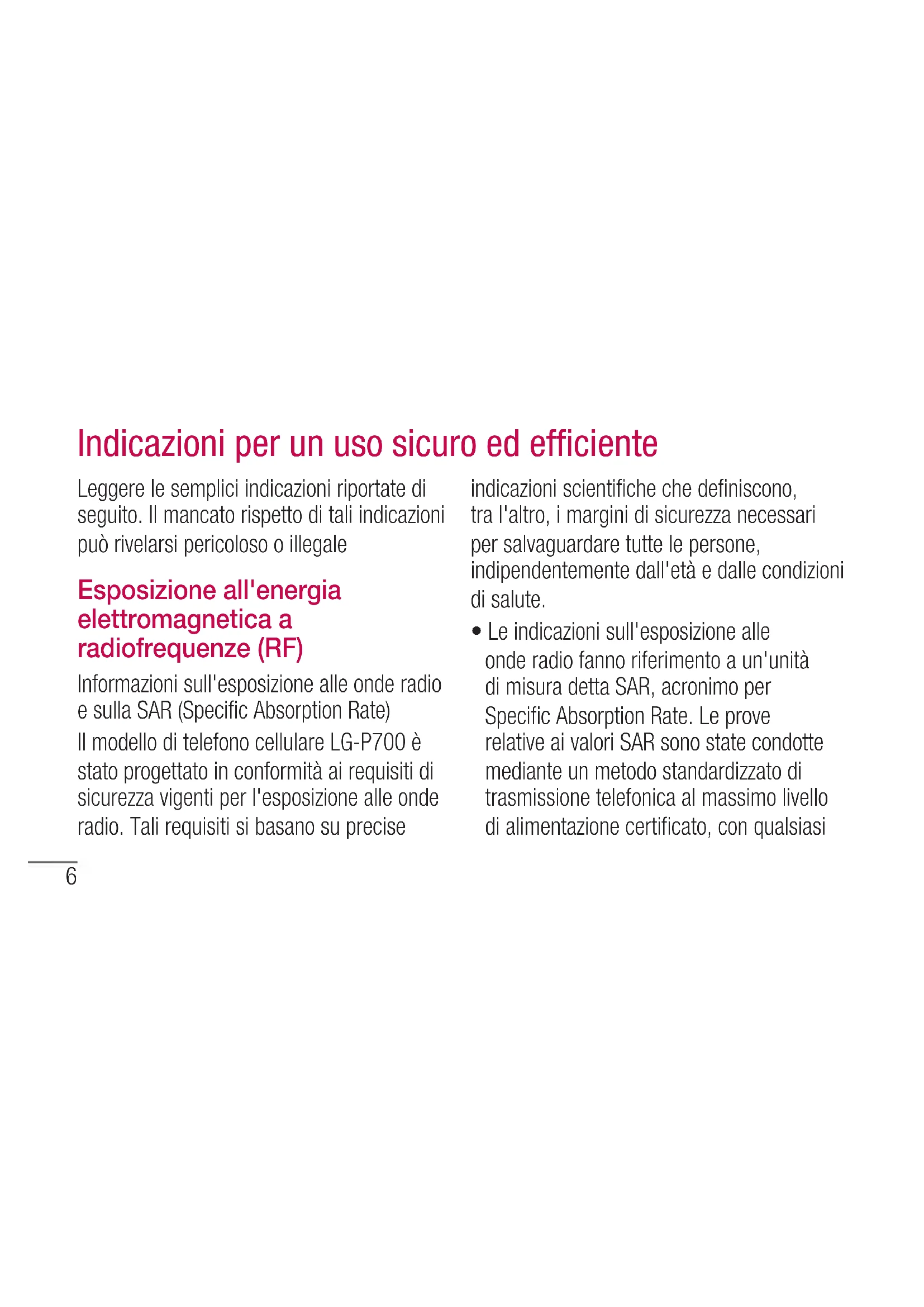 Con la presente, LG Electronics dichiara che il prodotto LG-P700 è conforme ai requisiti essenziali e alle altre disposizioni relative della direttiva 1999/5/EC. È possibile trovare una copia della Dichiarazione di conformità all'indirizzo http://www.lg.com/global/ support/cedoc/RetrieveProductCeDOC.jsp Contattare l'ufficio per informazioni sulle modalità d'uso consigliate: LG Electronics Inc. EU Representative, Krijgsman 1, 1186 DM Amstelveen, The Netherlands Temperature di utilizzo Max: +50 °C (scaricamento) +45 °C (in carica) Min: -10 °C Avviso: Software Open Source Per ottenere il codice sorgente corrispondente in GPL, LGPL, MPL e altre licenze open source, visitare il sito Web http://opensource.lge.com/ Tutti i termini di licenza, le dichiarazioni di responsabilità e gli avvisi di riferimento sono disponibili per il download con il codice sorgente.19 Smaltimento delle apparecchiature obsolete 1 Quandosuunprodottoèriportatoilsimbolodi unbidonedellaspazzaturabarratodaunacroce, taleprodottoècopertodalladirettivaeuropea 2002/96/EC. 2 Tuttiiprodottielettriciedelettronicidevono esseresmaltitiseparatamenterispettoalla raccoltadifferenziatamunicipale,mediante impiantidiraccoltaspecificiinstallatidaenti pubbliciodalleautoritàlocali. 3 Ilcorrettosmaltimentodell'unitàobsoleta contribuisceaprevenirepossibiliconseguenze negativesullasalutedegliindividuie sull'ambiente. 4Perinformazionipiùdettagliatesullosmaltimento delleapparecchiatureobsolete,contattareil municipio,ilserviziodismaltimentorifiutioil puntovenditaincuièstatoacquistatoilprodotto. Smaltimento delle batterie/accumulatori 1Ilsimbolodiunbidonedellaspazzaturabarrato daunacroce,riportatosubatterieoaccumulatori, indicacheilprodottoècopertodallaDirettiva Europea2006/66/EC. 2Questosimbolopotrebbeessereassociatoaisimboli chimicidimercurio(Hg),cadmio(Cd)opiombo(Pb) selabatteriacontienepiùdi0,0005%dimercurio, 0,002%dicadmioo0,004%dipiombo. 3Tuttelebatterie/accumulatoridevonoesseresmaltiti separatamenterispettoallaraccoltadifferenziata municipale,medianteimpiantidiraccoltaspecifici designatidalgovernoodalleautoritàlocali. 4Ilcorrettosmaltimentodibatterie/accumulatori obsoleticontribuisceaprevenirepossibili conseguenzenegativesull'ambiente,sullasalute degliindividuiesututtelealtrespecieviventi. 5Perinformazionipiùdettagliatesullosmaltimentodi batterieeaccumulatoriobsoleti,contattarel'ufficio delcomunediresidenza,ilserviziodismaltimento rifiutioilnegozioincuièstatoacquistatoilprodotto.20 Primadicontattarel'assistenza,verificare seiproblemiriscontraticoniltelefonosono descrittiinquestasezione.