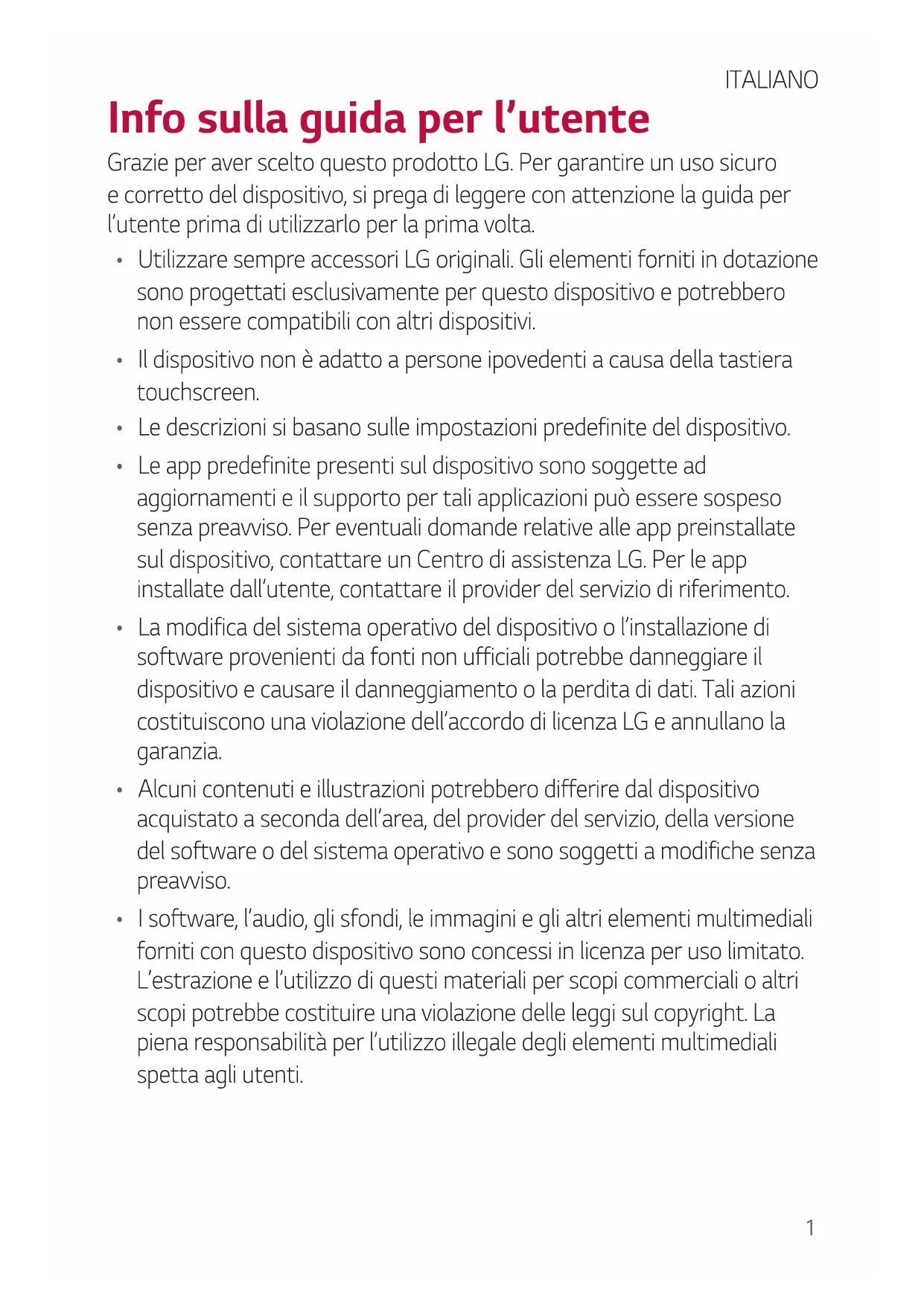 - La modifica del sistema operativo del dispositivo o l’installazione di software provenienti da fonti non ufficiali potrebbe danneggiare il dispositivo e causare il danneggiamento o la perdita di dati. Tali azioni costituiscono una violazione dell’accordo di licenza LG e annullano la garanzia.