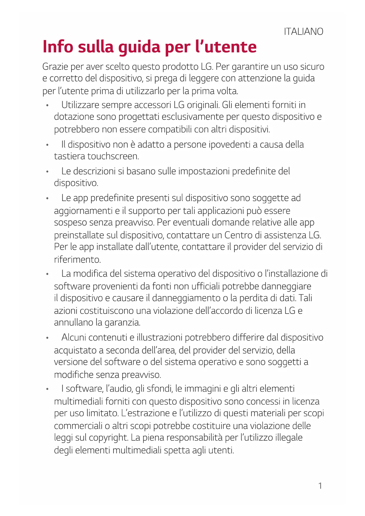 accumulateurs, veuillez contacter votre mairie, le service des ordures ménagères ou encore le magasin où vous avez acheté ce produit.1 Info sulla guida per l’utente Grazie per aver scelto questo prodotto LG. Per garantire un uso sicuro e corretto del dispositivo, si prega di leggere con attenzione la guida per l’utente prima di utilizzarlo per la prima volta.