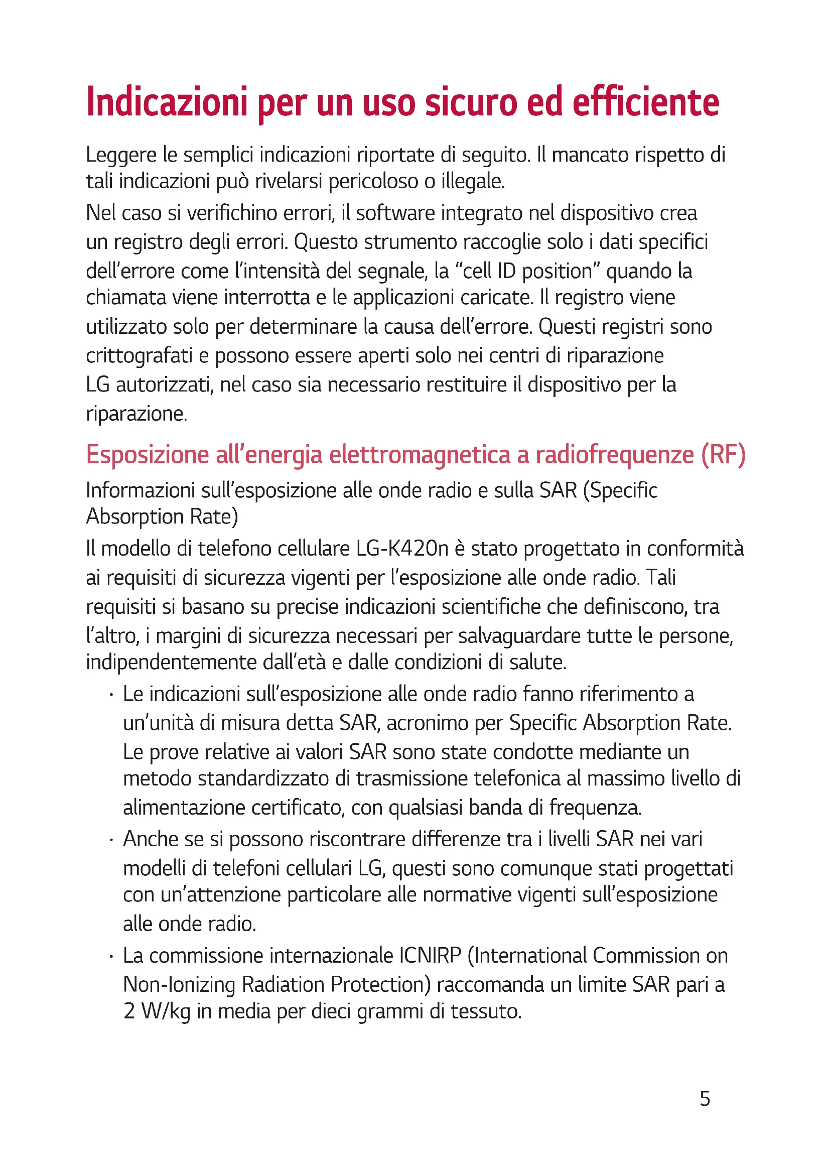 Contattarel’ufciorelativoallaconformità del prodotto ................................................................... 885 Indicazioni per un uso sicuro ed efficiente Leggere le semplici indicazioni riportate di seguito. Il mancato rispetto di tali indicazioni può rivelarsi pericoloso o illegale. Nel caso si verifichino errori, il software integrato nel dispositivo crea un registro degli errori. Questo strumento raccoglie solo i dati specifici dell’errore come l’intensità del segnale, la “cell ID position” quando la chiamata viene interrotta e le applicazioni caricate. Il registro viene utilizzato solo per determinare la causa dell’errore. Questi registri sono crittografati e possono essere aperti solo nei centri di riparazione LG autorizzati, nel caso sia necessario restituire il dispositivo per la riparazione. Esposizione all’energia elettromagnetica a radiofrequenze (RF) Informazioni sull’esposizione alle onde radio e sulla SAR (Specific Absorption Rate) Il modello di telefono cellulare LG-K420n è stato progettato in conformità ai requisiti di sicurezza vigenti per l’esposizione alle onde radio. Tali requisiti si basano su precise indicazioni scientifiche che definiscono, tra l’altro, i margini di sicurezza necessari per salvaguardare tutte le persone, indipendentemente dall’età e dalle condizioni di salute.