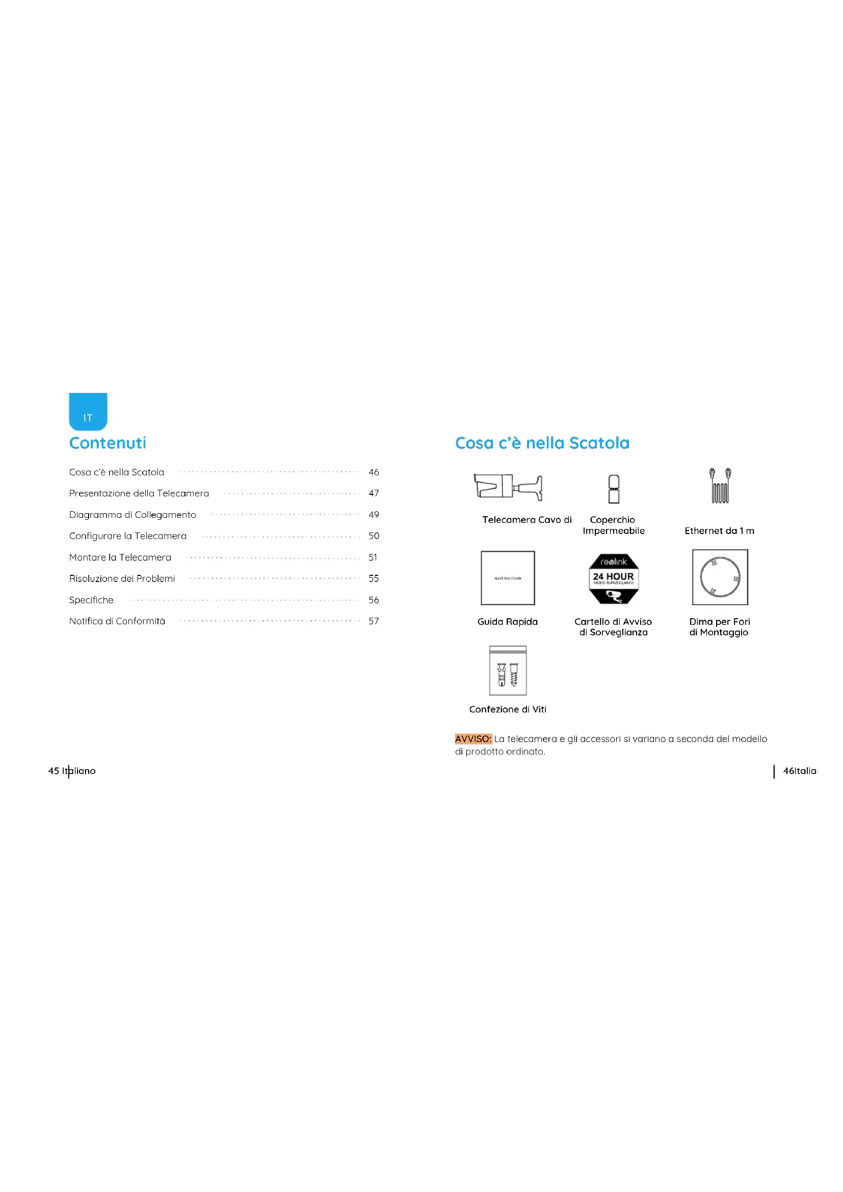 Telecamera Cavo di Ethernet da 1 m Coperchio Impermeabile Guida Rapida Cartello di Avviso di Sorveglianza Dima per Fori di Montaggio Confezione di Viti AVVISO: La telecamera e gli accessori si variano a seconda del modello di prodotto ordinato.AVVISO: