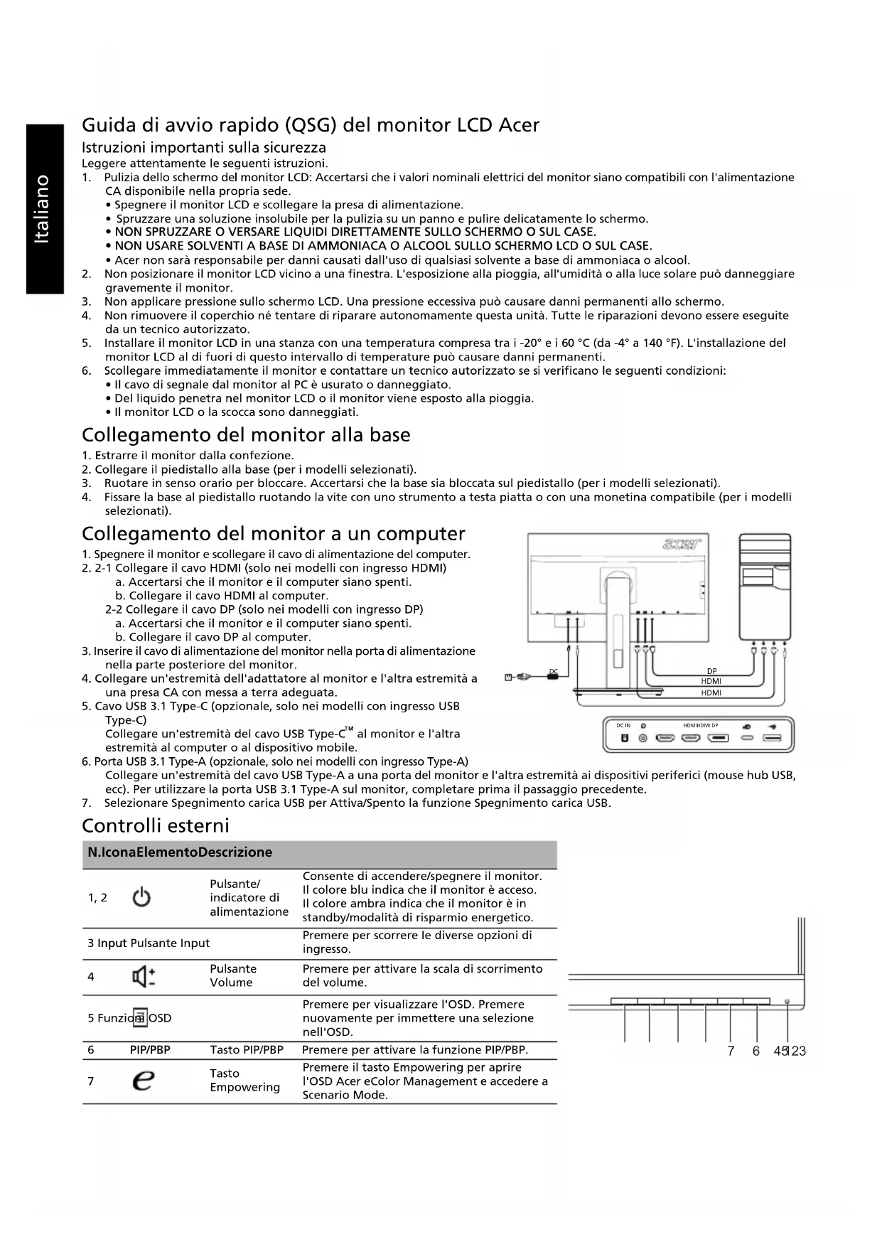 DC IN 1234567Italiano Norme e avvisi di sicurezza Normative FCC Questo dispositivo è stato testato ed è risultato conforme ai limiti stabiliti per i dispositivi digitali di Classe B, ai sensi della Parte 15 delle Normative FCC. Tali limiti sono stati stabiliti per fornire una ragionevole protezione da interferenze nocive presenti nelle installazioni residenziali. Questo dispositivo genera, utilizza e può emettere frequenze radio, e se non è installato e utilizzato secondo le istruzioni, può causare un'interferenza dannosa alle comunicazioni radio. Tuttavia, non vi è alcuna garanzia che l'interferenza non si verifichi in particolari installazioni. Se il dispositivo causa un'interferenza dannosa alla ricezione di radio e televisori, che può essere determinata spegnendo e accendendo il dispositivo, si prega l'utente di correggere l'interferenza applicando una o più delle seguenti misure: Riorientare o riposizionare l'antenna di ricezione. Aumentare la distanza tra il dispositivo e il ricevitore. Collegare il dispositivo a una presa su un circuito diverso da quello a cui è collegato il ricevitore. Per assistenza, contattare il rivenditore o un tecnico professionista nell'ambito di radio e televisori. Dichiarazione di conformità CE Con il presente documento, Acer Inc., dichiara che questo monitor LCD è conforme ai requisiti essenziali e ad altre normative pertinenti della Direttiva EMC 2014/30/UE, alla Direttiva sulla bassa tensione 2014/35/UE e alla Direttiva RoHS 2011/65/UE e alla Direttiva 2009/125/CE con riferimento all'istituzione di un quadro per l'elaborazione di specifiche per la progettazione ecocompatibile dei prodotti connessi al consumo energetico. Avviso: Per impedire danni al monitor, non sollevare il monitor per la sua base. Avviso: Cavi schermati Tutte i collegamenti ad altri dispositivi di elaborazione devono essere effettuati utilizzando cavi schermati per mantenere la conformità alle normative EMC. Avviso: Dispositivi periferici È possibile collegare a questa apparecchiatura solo le periferiche (dispositivi in ingresso/uscita, terminali, stampanti, ecc.) certificate per la conformità ai limiti della Classe B. L'uso di periferiche non certificate può causare interferenze alla ricezione di radio e TV. Avvertenza Eventuali modifiche o cambiamenti non espressamente approvati dal produttore potrebbero annullare l'autorità dell'utente, concessa dalla Federal Communications Commission, a utilizzare questo prodotto. Condizioni di utilizzo Questo dispositivo è conforme alla Parte 15 delle Normative FCC. L'utilizzo è soggetto alle seguenti due condizioni: (1) il dispositivo non deve causare interferenze dannose e (2) deve accettare tutte le interferenze ricevute, comprese quelle che possono causare un funzionamento indesiderato. Avviso: Utenti canadesi Questo apparecchio digitale di classe B è conforme alla normativa canadese ICES-003. Remarque à l'intention des utilisateurs canadiens Cet appareil numérique de la classe B est conforme à la norme NMB-003 du Canada. Smaltimento dei dispositivi utilizzati da parte di utenti privati nell'Unione Europea Questo simbolo sul prodotto o sulla confezione indica che il prodotto non deve essere smaltito insieme ai rifiuti domestici. È quindi responsabilità dell'utente smaltirlo portandolo presso un centro di raccolta autorizzato per il riciclo delle apparecchiature elettriche ed elettroniche. La raccolta differenziata e il riciclaggio di tali rifiuti provenienti da apparecchiature nel momento dello smaltimento aiuteranno a preservare le risorse naturali e garantiranno un riciclaggio adatto a proteggere il benessere dell'uomo e dell'ambiente. Per maggiori informazioni sui centri di raccolta, contattare il proprio ufficio locale, il servizio di smaltimento rifiuti o il negozio presso il quale è stato acquistato il prodotto. Avvertenza relativa ai campi magnetici Alcuni dispositivi elettronici, come dischi rigidi, dispositivi USB, computer tablet, laptop, telefoni cellulari, orologi, auricolari, altoparlanti, carte di credito, carte ID magnetiche, ecc. sono sensibili ai campi magnetici e possono essere danneggiati in modo permanente o disabilitati temporaneamente se vengono esposti a un campo magnetico troppo potente. Non posizionare i dispositivi elettronici vicino o nell'area magnetica della base del monitor. MagnetItaliano SPECIFICHE I manuali e altri documenti relativi al prodotto Acer sono disponibili sul sito Web di assistenza ufficiale Acer.