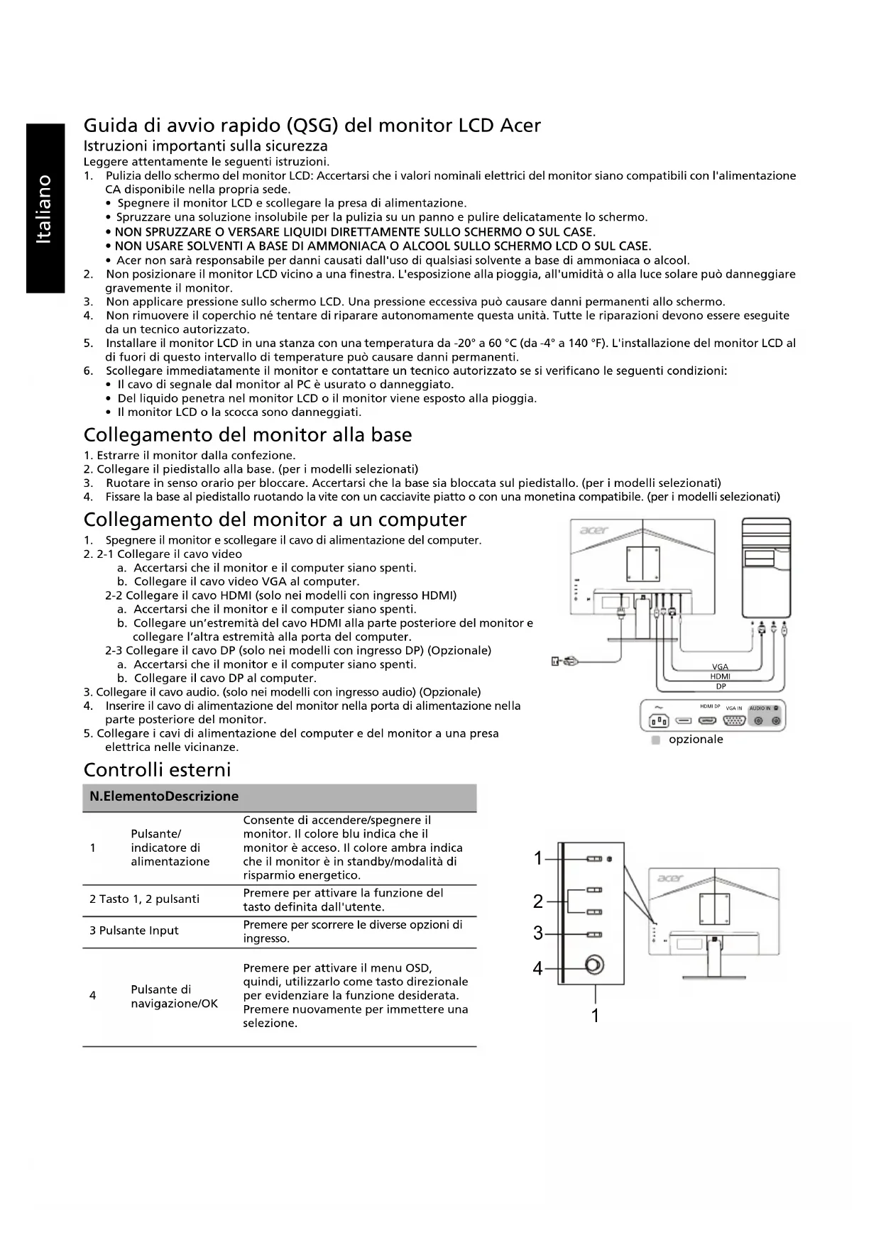 N tx rafraîcht Langue Délai de l'OSD Transparence Verrouillage OSD Entrée Source auto Mode Large Affectation raccourcis DDC/CI Allumé/Éteinte Niveau noir HDMI Md démarr rapide Informations sur l'écran Réinitial ts réglages Quitter Les spécifications varient selon le modèle et/ou la région.Italiano Guida di avvio rapido (QSG) del monitor LCD Acer Istruzioni importanti sulla sicurezza Leggere attentamente le seguenti istruzioni. 1. Pulizia dello schermo del monitor LCD: Accertarsi che i valori nominali elettrici del monitor siano compatibili con l'alimentazione CA disponibile nella propria sede.• Spegnere il monitor LCD e scollegare la presa di alimentazione.