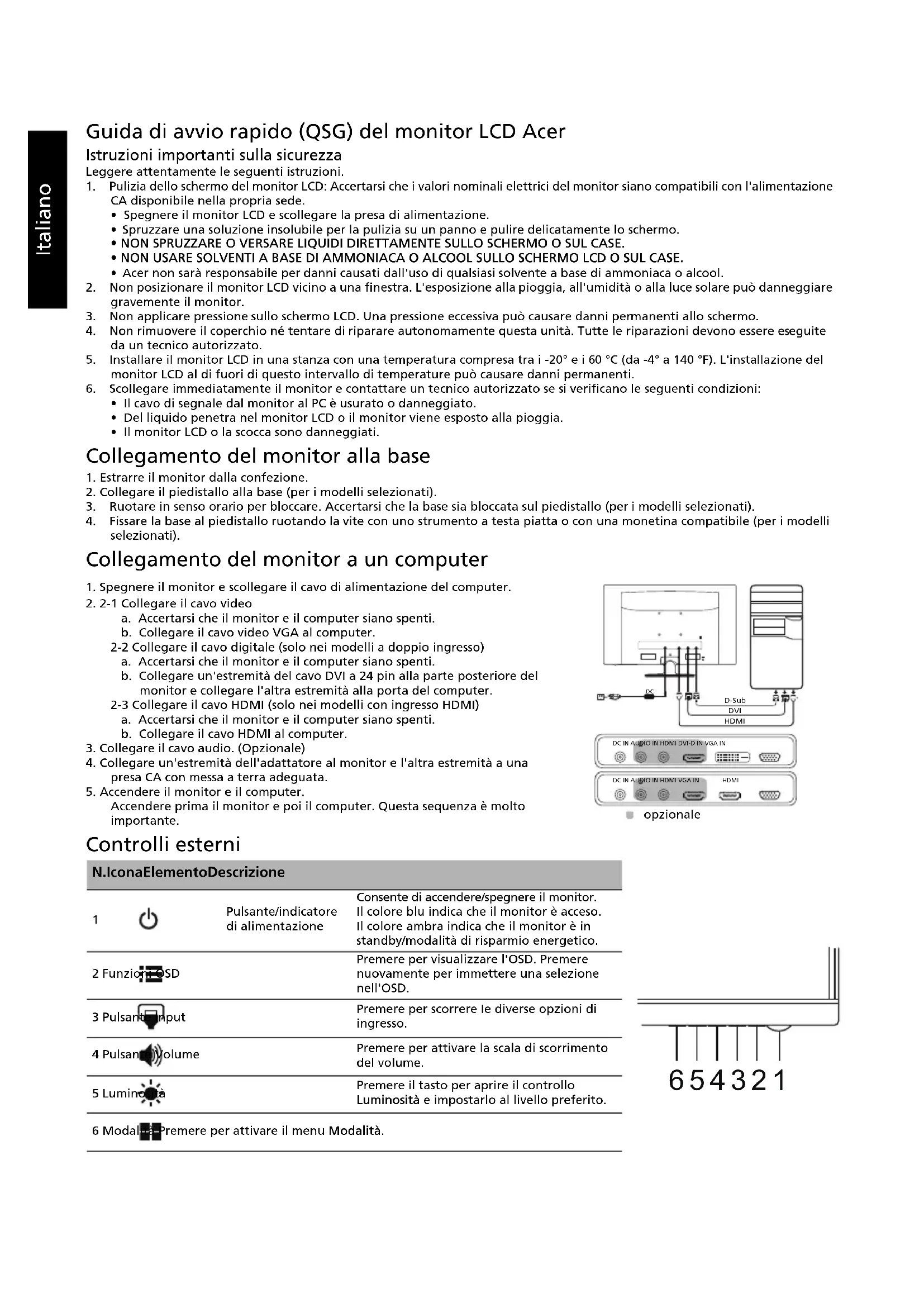 HDMI DVI DC IN AUDIO IN HDMI DVI-D IN VGA INDC IN AUDIO IN HDMI VGA IN HDMI opzionale 654321Italiano Norme e avvisi di sicurezza Normative FCC Questo dispositivo è stato testato ed è risultato conforme ai limiti stabiliti per i dispositivi digitali di Classe B, ai sensi della Parte 15 delle Normative FCC. Tali limiti sono stati stabiliti per fornire una ragionevole protezione da interferenze nocive presenti nelle installazioni residenziali. Questo dispositivo genera, utilizza e può emettere frequenze radio, e se non è installato e utilizzato secondo le istruzioni, può causare un'interferenza dannosa alle comunicazioni radio. Tuttavia, non vi è alcuna garanzia che l'interferenza non si verifichi in particolari installazioni. Se il dispositivo causa un'interferenza dannosa alla ricezione di radio e televisori, che può essere determinata spegnendo e accendendo il dispositivo, si prega l'utente di correggere l'interferenza applicando una o più delle seguenti misure: Riorientare o riposizionare l'antenna di ricezione. Aumentare la distanza tra il dispositivo e il ricevitore. Collegare il dispositivo a una presa su un circuito diverso da quello a cui è collegato il ricevitore. Per assistenza, contattare il rivenditore o un tecnico professionista nell'ambito di radio e televisori. Dichiarazione di conformità CE Con il presente documento, Acer Inc., dichiara che questo monitor LCD è conforme ai requisiti essenziali e ad altre normative pertinenti della Direttiva EMC 2014/30/UE, alla Direttiva sulla bassa tensione 2014/35/UE e alla Direttiva RoHS 2011/65/UE e alla Direttiva 2009/125/CE con riferimento all'istituzione di un quadro per l'elaborazione di specifiche per la progettazione ecocompatibile dei prodotti connessi al consumo energetico. Avviso: Per impedire danni al monitor, non sollevare il monitor per la sua base. Avviso: Cavi schermati Tutte i collegamenti ad altri dispositivi di elaborazione devono essere effettuati utilizzando cavi schermati per mantenere la conformità alle normative EMC. Avviso: Dispositivi periferici È possibile collegare a questa apparecchiatura solo le periferiche (dispositivi in ingresso/uscita, terminali, stampanti, ecc.) certificate per la conformità ai limiti della Classe B. L'uso di periferiche non certificate può causare interferenze alla ricezione di radio e TV. Avvertenza Eventuali modifiche o cambiamenti non espressamente approvati dal produttore potrebbero annullare l'autorità dell'utente, concessa dalla Federal Communications Commission, a utilizzare questo prodotto. Condizioni di utilizzo Questo dispositivo è conforme alla Parte 15 delle Normative FCC. L'utilizzo è soggetto alle seguenti due condizioni: (1) il dispositivo non deve causare interferenze dannose e (2) deve accettare tutte le interferenze ricevute, comprese quelle che possono causare un funzionamento indesiderato. Avviso: Utenti canadesi Questo apparecchio digitale di classe B è conforme alla normativa canadese ICES-003. Remarque à l'intention des utilisateurs canadiens Cet appareil numérique de la classe B est conforme à la norme NMB-003 du Canada. Smaltimento dei dispositivi utilizzati da parte di utenti privati nell'Unione Europea Questo simbolo sul prodotto o sulla confezione indica che il prodotto non deve essere smaltito insieme ai rifiuti domestici. È quindi responsabilità dell'utente smaltirlo portandolo presso un centro di raccolta autorizzato per il riciclo delle apparecchiature elettriche ed elettroniche. La raccolta differenziata e il riciclaggio di tali rifiuti provenienti da apparecchiature nel momento dello smaltimento aiuteranno a preservare le risorse naturali e garantiranno un riciclaggio adatto a proteggere il benessere dell'uomo e dell'ambiente. Per maggiori informazioni sui centri di raccolta, contattare il proprio ufficio locale, il servizio di smaltimento rifiuti o il negozio presso il quale è stato acquistato il prodotto.Italiano SPECIFICHE I manuali e altri documenti relativi al prodotto Acer sono disponibili sul sito Web di assistenza ufficiale Acer.