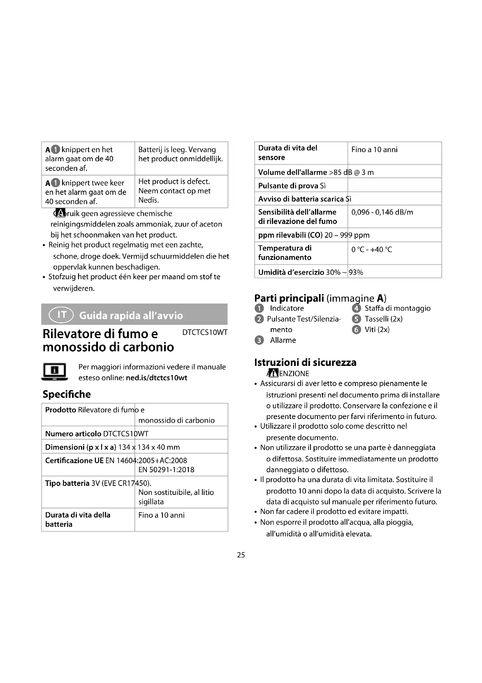 Guida rapida all’avvio Rilevatore di fumo e monossido di carbonio DTCTCS10WTPer maggiori informazioni vedere il manuale esteso online: ned.is/dtctcs10wt Speciche Prodotto Rilevatore di fumo e monossido di carbonioNumero articolo DTCTCS10WTDimensioni (p x l x a) 134 x 134 x 40 mmCerticazione UE EN 14604:2005+AC:2008EN 50291-1:2018Tipo batteria 3V (EVE CR17450). Non sostituibile, al litio sigillataDurata di vita della batteriaFino a 10 anniDurata di vita del sensoreFino a 10 anniVolume dell'allarme >85 dB @ 3 mPulsante di prova SìAvviso di batteria scarica SìSensibilità dell’allarme di rilevazione del fumo0,096 - 0,146 dB/mppm rilevabili (CO) 20 – 999 ppmTemperatura di funzionamento0 °C - +40 °CUmidità d’esercizio 30% ~ 93% Parti principali (immagine A) 1 Indicatore 2 Pulsante Test/Silenzia- mento 3 Allarme 4 Staa di montaggio 5 Tasselli (2x) 6 Viti (2x) Istruzioni di sicurezza