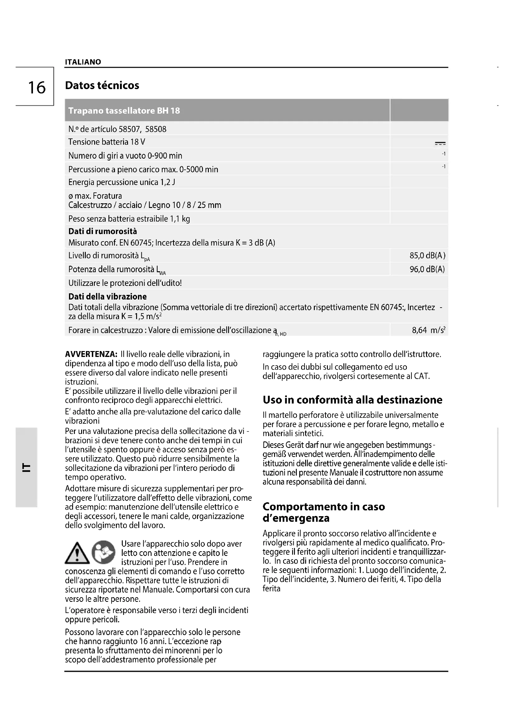 teggere l‘utilizzatore dall‘eetto delle vibrazioni,come ad esempio: manutenzione dell‘utensileelettrico e degli accessori, tenere le manicalde, organizzazione dello svolgimento dellavoro. Usare l‘apparecchio solo dopo aver letto con attenzione e capito le istruzioni per l‘uso. Prendere in conoscenza gli elementi di comando e l’uso corretto dell’apparecchio. Rispettare tutte le istruzioni di sicurezza riportate nel Manuale. Comportarsi con cura verso le altre persone. L‘operatore è responsabile verso i terzi degli incidenti oppure pericoli. Possono lavorare con l‘apparecchiosolo le persone che hannoraggiunto 16 anni. L’eccezionerap