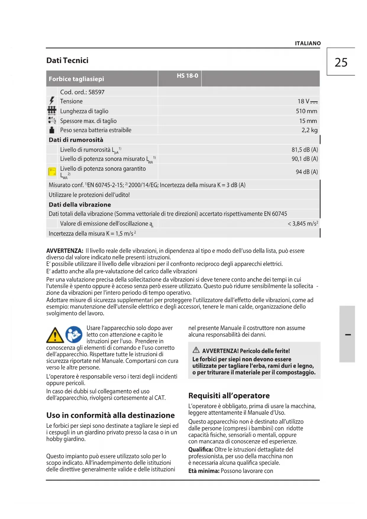 zione da vibrazioni per l‘intero periododi tempo operativo. Adottare misure di sicurezza supplementari perproteggere l‘utilizzatore dall‘eetto delle vibrazioni,come ad esempio: manutenzione dell‘utensileelettrico e degli accessori, tenere le manicalde, organizzazione dello svolgimento dellavoro. ITALIANO Usare l‘apparecchio solo dopo aver letto con attenzione e capito le istruzioni per l‘uso. Prendere in conoscenza gli elementi di comando e l’uso corretto dell’apparecchio. Rispettare tutte le istruzioni di sicurezza riportate nel Manuale. Comportarsi con cura verso le altre persone. L‘operatore è responsabile verso i terzi degli incidenti oppure pericoli. In caso dei dubbi sul collegamento ed uso dell‘apparecchio, rivolgersi cortesemente al CAT. Uso in conformità alla destinazione Le forbici per siepi sono destinate a tagliare le siepi ed i cespugli in un giardino privato presso la casa o in un hobby giardino. Questo impianto può essere utilizzato solo per lo scopo indicato. All‘inadempimento delle istituzioni delle direttive generalmente valide e delle istituzioni nel presente Manuale il costruttore non assume alcuna responsabilità dei danni. AVVERTENZA! Pericolo delle ferite! Le forbici per siepi non devono essere utilizzate per tagliare l‘erba, rami duri e legno, o per triturare il materiale per il compostaggio. Requisiti all’operatore L’operatore è obbligato, prima diusare la macchina, leggereattentamente il Manuale d’Uso. Questo apparecchio non è destinato all’utilizzo dalle persone (compresi i bambini) con ridotte capacità siche, sensoriali o mentali, oppure con mancanza di conoscenze ed esperienze. Qualica: Oltre le istruzionidettagliate del professionista, peruso della macchina non ènecessaria alcuna qualicaspeciale. Età minima: Possono lavorare con