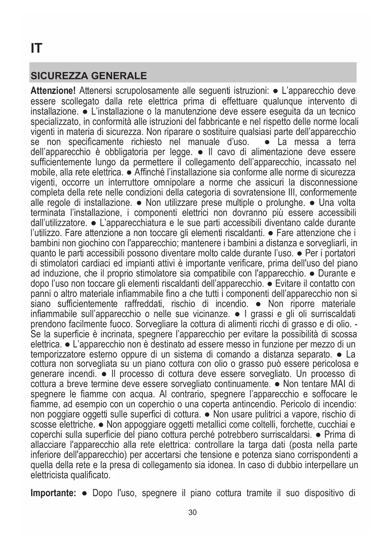 SICUREZZA GENERALE Attenzione! Attenersi scrupolosamente alle seguenti istruzioni: Ɣ L’apparecchio deve essere scollegato dalla rete elettrica prima di effettuare qualunque intervento di installazione. Ɣ L’installazione o la manutenzione deve essere eseguita da un tecnico specializzato, in conformità alle istruzioni del fabbricante e nel rispetto delle norme locali vigenti in materia di sicurezza. Non riparare o sostituire qualsiasi parte dell’apparecchio se non specificamente richiesto nel manuale d’uso. Ɣ La messa a terra dell’apparecchio è obbligatoria per legge. Ɣ Il cavo di alimentazione deve essere sufficientemente lungo da permettere il collegamento dell’apparecchio, incassato nel mobile, alla rete elettrica. Ɣ Affinché l’installazione sia conforme alle norme di sicurezza vigenti, occorre un interruttore omnipolare a norme che assicuri la disconnessione completa della rete nelle condizioni della categoria di sovratensione III, conformemente alle regole di installazione. Ɣ Non utilizzare prese multiple o prolunghe. Ɣ Una volta terminata l’installazione, i componenti elettrici non dovranno più essere accessibili dall’utilizzatore. Ɣ L’apparecchiatura e le sue parti accessibili diventano calde durante l’utilizzo. Fare attenzione a non toccare gli elementi riscaldanti. Ɣ Fare attenzione che i bambini non giochino con l'apparecchio; mantenere i bambini a distanza e sorvegliarli, in quanto le parti accessibili possono diventare molto calde durante l’uso. Ɣ Per i portatori di stimolatori cardiaci ed impianti attivi è importante verificare, prima dell'uso del piano ad induzione, che il proprio stimolatore sia compatibile con l'apparecchio. Ɣ Durante e dopo l’uso non toccare gli elementi riscaldanti dell’apparecchio. Ɣ Evitare il contatto con panni o altro materiale infiammabile fino a che tutti i componenti dell’apparecchio non si siano sufficientemente raffreddati, rischio di incendio. Ɣ Non riporre materiale infiammabile sull’apparecchio o nelle sue vicinanze. Ɣ I grassi e gli oli surriscaldati prendono facilmente fuoco. Sorvegliare la cottura di alimenti ricchi di grasso e di olio. - Se la superficie è incrinata, spegnere l’apparecchio per evitare la possibilità di scossa elettrica. Ɣ L’apparecchio non è destinato ad essere messo in funzione per mezzo di un temporizzatore esterno oppure di un sistema di comando a distanza separato. Ɣ La cottura non sorvegliata su un piano cottura con olio o grasso può essere pericolosa e generare incendi. Ɣ Il processo di cottura deve essere sorvegliato. Un processo di cottura a breve termine deve essere sorvegliato continuamente. Ɣ Non tentare MAI di spegnere le fiamme con acqua. Al contrario, spegnere l’apparecchio e soffocare le fiamme, ad esempio con un coperchio o una coperta antincendio. Pericolo di incendio: non poggiare oggetti sulle superfici di cottura. Ɣ Non usare pulitrici a vapore, rischio di scosse elettriche. Ɣ Non appoggiare oggetti metallici come coltelli, forchette, cucchiai e coperchi sulla superficie del piano cottura perché potrebbero surriscaldarsi. Ɣ Prima di allacciare l'apparecchio alla rete elettrica: controllare la targa dati (posta nella parte inferiore dell'apparecchio) per accertarsi che tensione e potenza siano corrispondenti a quella della rete e la presa di collegamento sia idonea. In caso di dubbio interpellare un elettricista qualificato. Importante: Ɣ Dopo l'uso, spegnere il piano cottura tramite il suo dispositivo di31 comando e non fare affidamento sul rivelatore di pentole. Ɣ Evitare le fuoriuscite di liquido, pertanto per bollire o riscaldare liquidi, ridurre l’alimentazione di calore. Ɣ Non lasciare gli elementi riscaldanti accesi con pentole e padelle vuote oppure senza recipienti. Ɣ Una volta terminato di cucinare, spegnere la relativa zona di cottura. Ɣ Per la cottura non utilizzate mai dei fogli di carta d'alluminio, e non posate mai direttamente prodotti imballati con alluminio. L'alluminio fonderebbe e danneggerebbe irrimediabilmente il vostro apparecchio. Ɣ Non riscaldare mai una scatoletta o un barattolo di latta contenente alimenti senza prima averlo aperto: potrebbe esplodere! Questa avvertenza si applica a tutti gli altri tipi di piani cottura. Ɣ L'utilizzo di una potenza elevata come la funzione Booster non è adatta per il riscaldamento di alcuni liquidi come ad esempio l'olio per friggere. L'eccessivo calore potrebbe essere pericoloso. In questi casi si consiglia l'utilizzo di una potenza meno elevata. Ɣ l recipienti devono essere posti direttamente sul piano cottura e devono essere centrati. In nessun caso inserire altri oggetti tra la pentola e il piano cottura. Ɣ In situazione di elevate temperature l'apparecchio diminuisce automaticamente il livello di potenza delle zone di cottura. Ɣ Prima di qualsiasi operazione di pulizia o manutenzione, disinserire l'apparecchio dalla rete elettrica togliendo la spina o staccando l’interruttore generale dell’abitazione. Ɣ Per tutte le operazioni di installazione e manutenzione utilizzare guanti da lavoro. Ɣ L’apparecchio può essere utilizzato da bambini di età non inferiore a 8 anni e da persone con ridotte capacità fisiche, sensoriali o mentali, o prive di esperienza o della necessaria conoscenza, purché sotto sorveglianza oppure dopo che le stesse abbiano ricevuto istruzioni relative all’uso sicuro dell’apparecchio e alla comprensione dei pericoli ad esso inerenti. Ɣ I bambini devono essere controllati affinché non giochino con l’apparecchio. Ɣ La pulizia e la manutenzione non deve essere effettuata da bambini senza sorveglianza. Ɣ Il locale deve disporre di sufficiente ventilazione, quando l'apparecchio viene utilizzato contemporaneamente ad altri apparecchi a combustione di gas o altri combustibili. Ɣ L'apparecchio va frequentemente pulito sia internamente che esternamente (ALMENO UNA VOLTA AL MESE), rispettare comunque quanto espressamente indicato n
