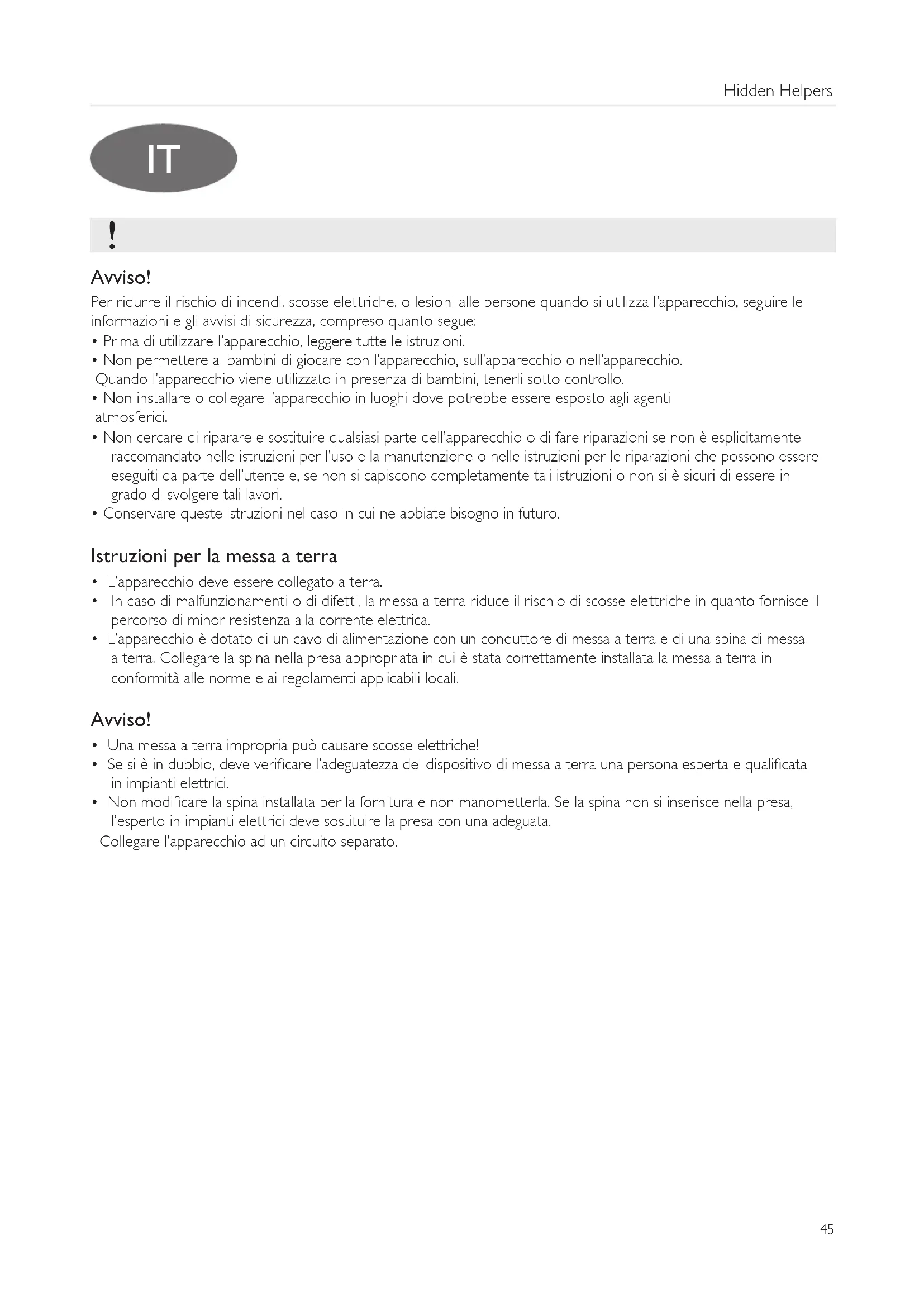 - L’apparecchio è dotato di un cavo di alimentazione con un conduttore di messa a terra e di una spina di messa a terra. Collegare la spina nella presa appropriata in cui è stata correttamente installata la messa a terra in conformità alle norme e ai regolamenti applicabili locali. Avviso!