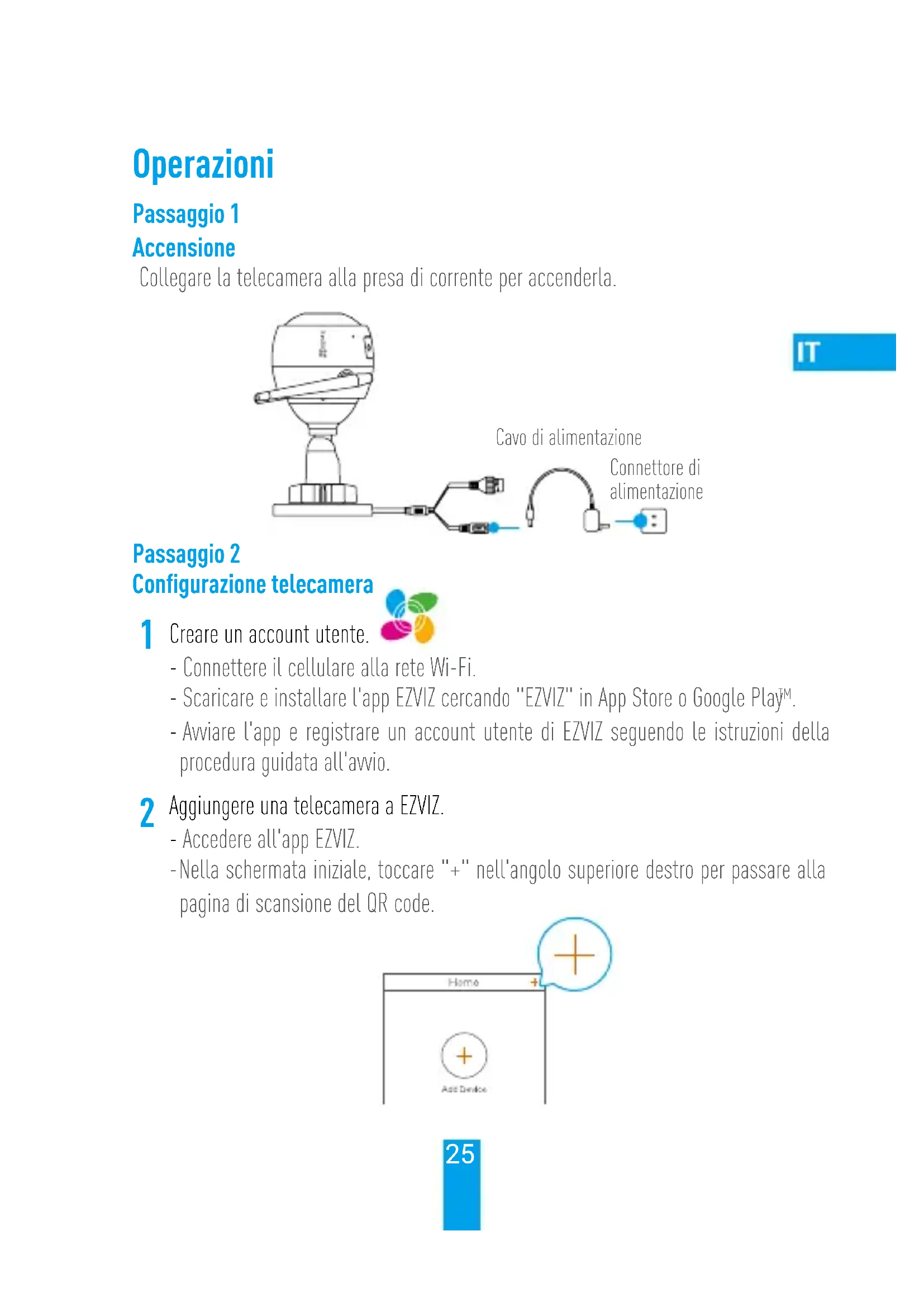 Creare un account utente. - Connettere il cellulare alla rete Wi-Fi. - Scaricare e installare l'app EZVIZ cercando "EZVIZ" in App Store o Google Play