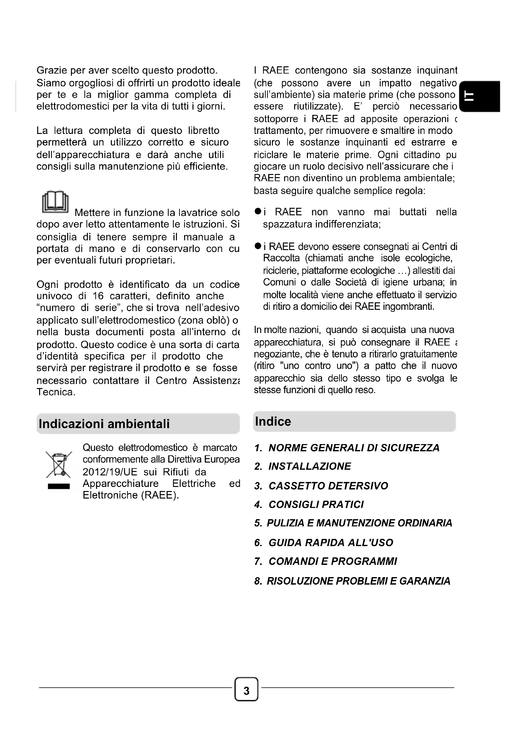 Grazie per aver scelto questo prodotto. Siamo orgogliosi di offrirti un prodotto ideale per te e la miglior gamma completa di elettrodomestici per la vita di tutti i giorni. La lettura completa di questo libretto permetterà un utilizzo corretto e sicuro dell’apparecchiatura e darà anche utili consigli sulla manutenzione più efficiente. Mettere in funzione la lavatrice solo dopo aver letto attentamente le istruzioni. Si consiglia di tenere sempre il manuale a portata di mano e di conservarlo con cura per eventuali futuri proprietari. Ogni prodotto è identificato da un codice univoco di 16 caratteri, definito anche “numero di serie”, che si trova nell’adesivo applicato sull’elettrodomestico (zona oblò) o nella busta documenti posta all’interno del prodotto. Questo codice è una sorta di carta d’identità specifica per il prodotto che servirà per registrare il prodotto e se fosse necessario contattare il Centro Assistenza Tecnica.