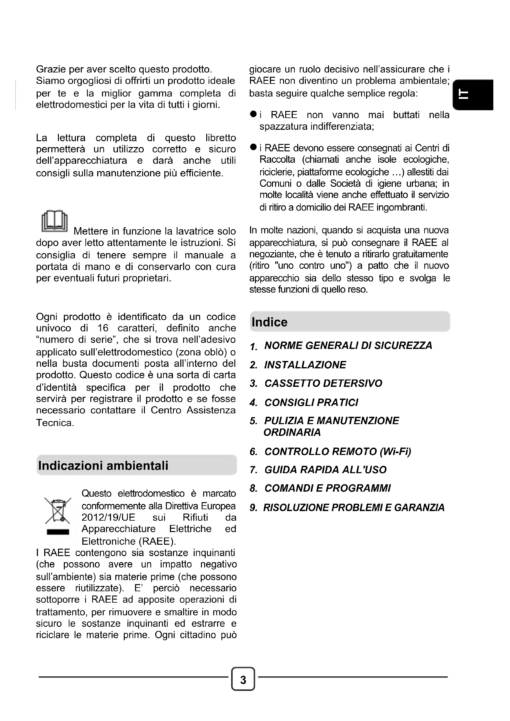 Mettere in funzione la lavatrice solo dopo aver letto attentamente le istruzioni. Si consiglia di tenere sempre il manuale a portata di mano e di conservarlo con cura per eventuali futuri proprietari.
