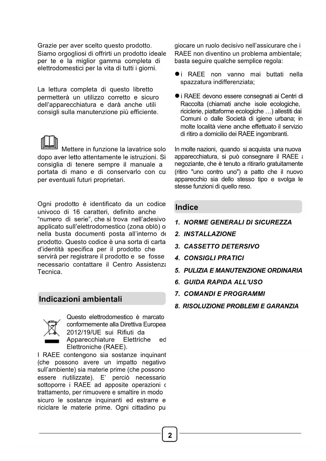 Grazie per aver scelto questo prodotto. Siamo orgogliosi di offrirti un prodotto ideale per te e la miglior gamma completa di elettrodomestici per la vita di tutti i giorni. La lettura completa di questo libretto permetterà un utilizzo corretto e sicuro dell’apparecchiatura e darà anche utili consigli sulla manutenzione più efficiente. Mettere in funzione la lavatrice solo dopo aver letto attentamente le istruzioni. Si consiglia di tenere sempre il manuale a portata di mano e di conservarlo con cura per eventuali futuri proprietari. Ogni prodotto è identificato da un codice univoco di 16 caratteri, definito anche “numero di serie”, che si trova nell’adesivo applicato sull’elettrodomestico (zona oblò) o nella busta documenti posta all’interno del prodotto. Questo codice è una sorta di carta d’identità specifica per il prodotto che servirà per registrare il prodotto e se fosse necessario contattare il Centro Assistenza Tecnica.
