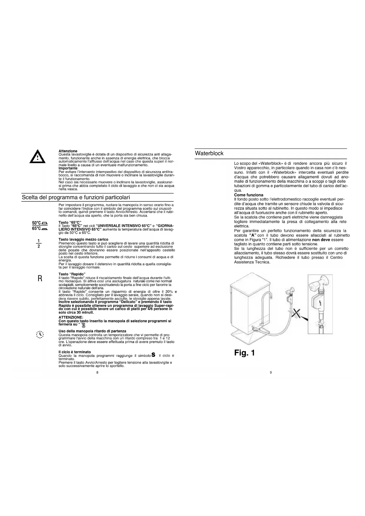 Lo scopo del «Waterblock» è di rendere ancora più sicuro il Vostro apparecchio, in particolare quando in casa non c’è nes- suno. Infatti con il «Waterblock» intercetta eventuali perdite d’acqua che potrebbero causare allagamenti dovuti ad ano- malie di funzionamento della macchina o a scoppi o tagli delle tubazioni di gomma e particolarmente del tubo di carico dell’ac- qua. Come funziona Il fondo posto sotto l’elettrodomestico raccoglie eventuali per- dite d’acqua che tramite un sensore chiude la valvola di sicu- rezza situata sotto al rubinetto. In questo modo si impedisce all’acqua di fuoriuscire anche con il rubinetto aperto. Se la scatola che contiene parti elettriche viene danneggiata togliere immediatamente la presa di collegamento alla rete elettrica. Per garantire un perfetto funzionamento della sicurezza la scatola “A” con il tubo devono essere allacciati al rubinetto come in Figura “1”. Il tubo di alimentazione non deve essere tagliato in quanto contiene parti sotto tensione. Se la lunghezza del tubo non è sufficiente per un corretto allacciamento, il tubo stesso dovrà essere sostituito con uno di lunghezza adeguata. Richiedere il tubo presso il Centro Assistenza Tecnica. Waterblock Fig. 111