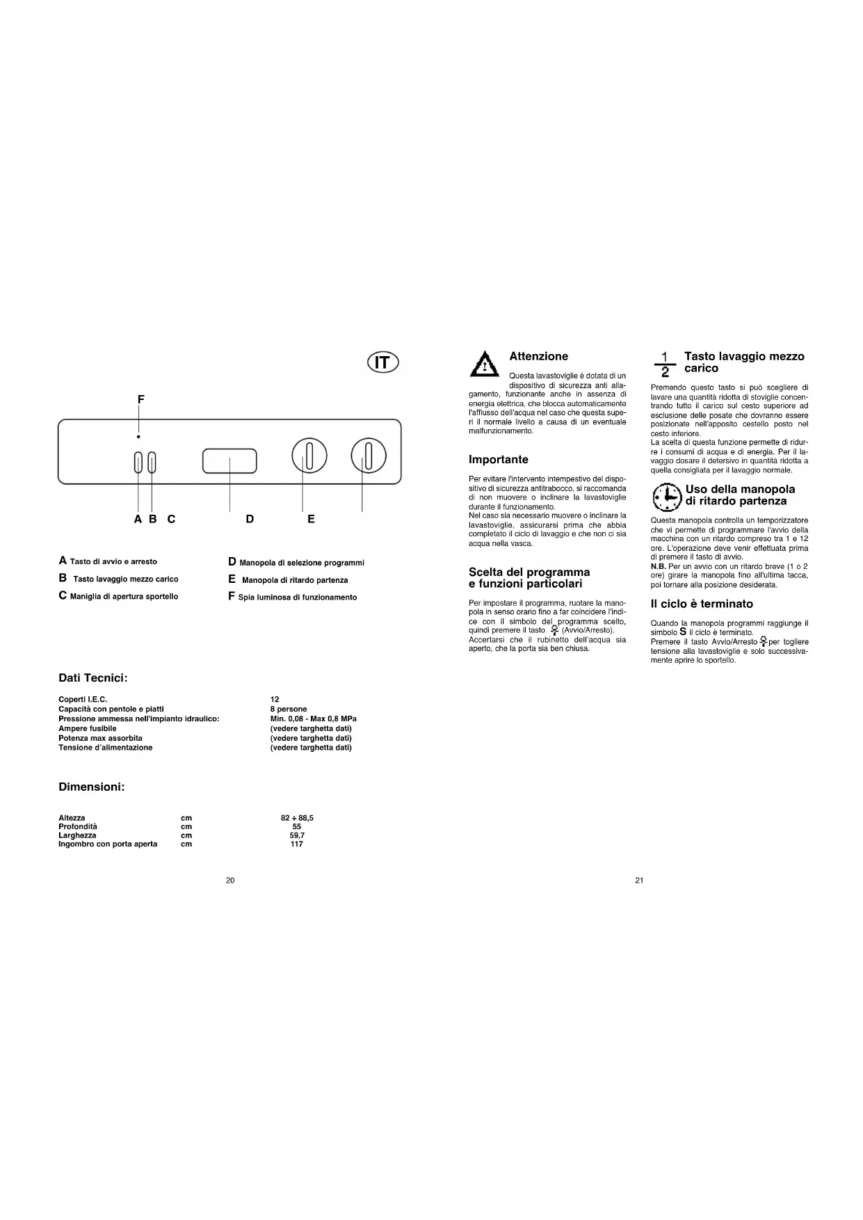 8 persone Min. 0,08 - Max 0,8 MPa (vedere targhetta dati) (vedere targhetta dati) (vedere targhetta dati) A Tasto di avvio e arresto B Tasto lavaggio mezzo carico C Maniglia di apertura sportello D Manopola di selezione programmi E Manopola di ritardo partenza F Spia luminosa di funzionamento Dimensioni: Altezza Profondità Larghezza Ingombro con porta aperta