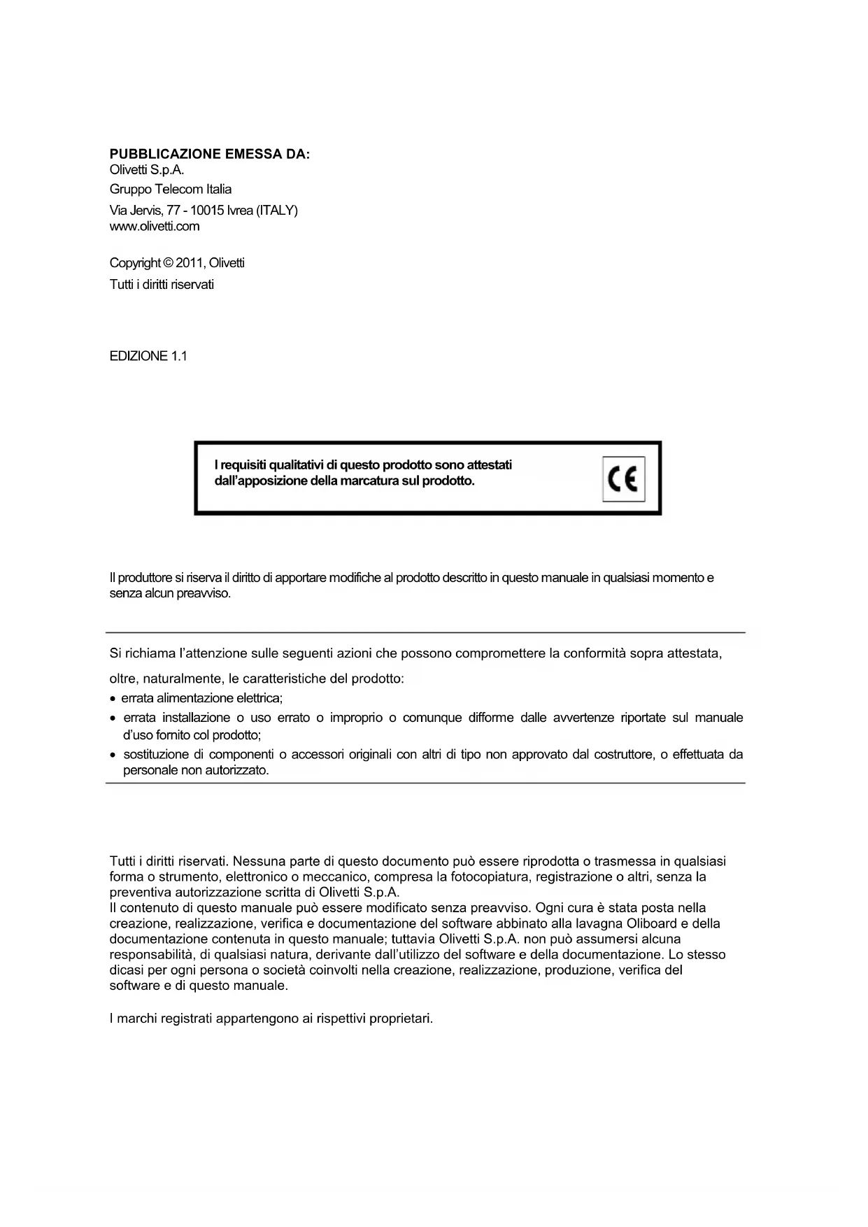 Tutti i diritti riservati. Nessuna parte di questo documento può essere riprodotta o trasmessa in qualsiasi forma o strumento, elettronico o meccanico, compresa la fotocopiatura, registrazione o altri, senza la preventiva autorizzazione scritta di Olivetti S.p.A. Il contenuto di questo manuale può essere modificato senza preavviso. Ogni cura è stata posta nella creazione, realizzazione, verifica e documentazione del software abbinato alla lavagna Oliboard e della documentazione contenuta in questo manuale; tuttavia Olivetti S.p.A. non può assumersi alcuna responsabilità, di qualsiasi natura, derivante dall’utilizzo del software e della documentazione. Lo stesso dicasi per ogni persona o società coinvolti nella creazione, realizzazione, produzione, verifica del software e di questo manuale. I marchi registrati appartengono ai rispettivi proprietari.