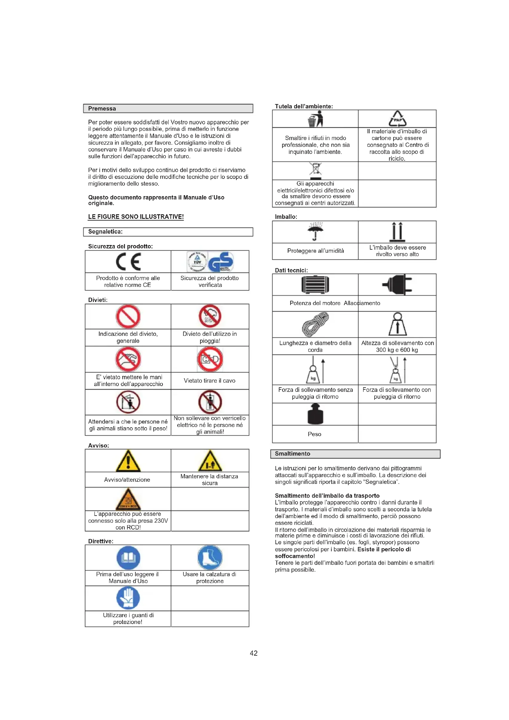 Requisiti all'operatore L’operatore è obbligato, prima di usare la macchina, leggere attentamente il Manuale d’Uso. Qualifica Oltre le istruzioni dettagliate del professionista, per uso della macchina non è necessaria alcuna qualifica speciale. Età minima Con la macchina possono lavorare solo le persone che hanno raggiunto 16 anni. L’eccezione rappresenta lo sfruttamento dei minorenni per lo scopo dell’addestramento professionale per raggiungere la pratica sotto controllo dell‘istruttore. Istruzioni Utilizzo della macchina richiede solo le istruzioni adeguate del professionista rispettivamente leggere il Manuale d’Uso. Non sono necessarie le istruzioni speciali. Dati tecnici Allacciamento 230 V~50 Hz Potenza del motore 1050 W max. forza di sollevamento con puleggia di ritorno 600 kg max. forza di sollevamento senza puleggia di ritorno 300 kg max. altezza della salita 300 kg 11 m max. altezza della salita 600 kg 5,5 m Diametro della corda 4,5 mm Lunghezza fune 12 m Tipo di protezione IP 54 Peso 17,6 kg Trasporto e stoccaggio Attendersi a che l’apparecchio sia conservato nel luogo asciutto, inaccessibile ai bambini e persone non adatte. Nel caso che l’apparecchio non dovrebbe essere utilizzato per tempo più lungo, pulirlo accuratamente. Montaggio e preparazioni Installazione x Togliendo l’imballo dell’avvolgitore a corda, accertarsi che la fornitura contiene tutte parti e controllare le perfette condizioni dell’avvolgitore e degli accessori. Per mantenere la validità della garanzia occorre comunicare la contestazione eventuale immediatamente dopo la consegna. x Leggere attentamente le istruzioni della manovra fornite con avvolgitore a corda (questo Manuale) e nell’installazione dell’avvolgitore procedere precisamente, secondo i dati sotto indicati. x La parte portante, dove dovrà essere installato l’avvolgitore deve essere in grado di subire il peso doppio del carico da sollevare (Si consiglia di consultare il professionista). x L’avvolgitore a corda viene montato soprattutto sul braccio ribaltabile dei tubi. Il tubo d’acciaio da utilizzare deve avere il diametro di 43 mm e lo spessore della parete min. 3 mm. x Il braccio oscillante deve essere ancorato rigidamente nel muro. L’ancoraggio deve essere stabile, resistente alle forze formate. x Badare a che l’apparecchio sia fissato sempre in orizzontale, mai storto. x Con uso della puleggia di ritorno agganciare il gancio (d) al portagancio (j) della mensola (o). Messa in esercizio dell’avvolgitore a corda Passo 1 Accertarsi che la tensione di rete corrisponde alla tensione sulla targhetta dell’avvolgitore a corda. Passo 2 Controllare la corda d’acciaio e tutti dispositivi di sicurezza dell’avvolgitore. Passo 3 Controllare che l’avvolgitore sia correttamente installato ed in grado di sopportare il peso max. del carico da sollevare. 45Passo 4 Assicurare il carico al ribaltamento e oscillazioni e controllare gli elementi portanti. Passo 5 Sollevare il peso in verticale e controllato. L’avvolgitore a corda è quindi pronto ad essere utilizzato! Pericoli residuali e misure di protezione Pericoli residuali elettrici Pericolo Descrizione Azioni di protezione Contatto elettrico diretto La scossa elettrica RCD Contatto elettrico indiretto Scossa elettrica attraverso un fluido RCD Altri pericoli Pericolo Descrizione Azioni di protezione Oggetti lanciati e/o spruzzi dei liquidi Gasolio può spruzzare dall’avvolgitore e causare le gravi ferite. Utilizzare sempre i guanti ed occhiali di protezione. Scivolo, inciampata, caduta delle persone Cavo d’alimentazione e l’apparecchio solo possono creare il pericolo dell’inciampata. Adottare le misure di prevenzione a seconda del tipo d’installazione. (luogo d’installazione adatto, identificazione del luogo d’installazione etc.) Manutenzione e cura