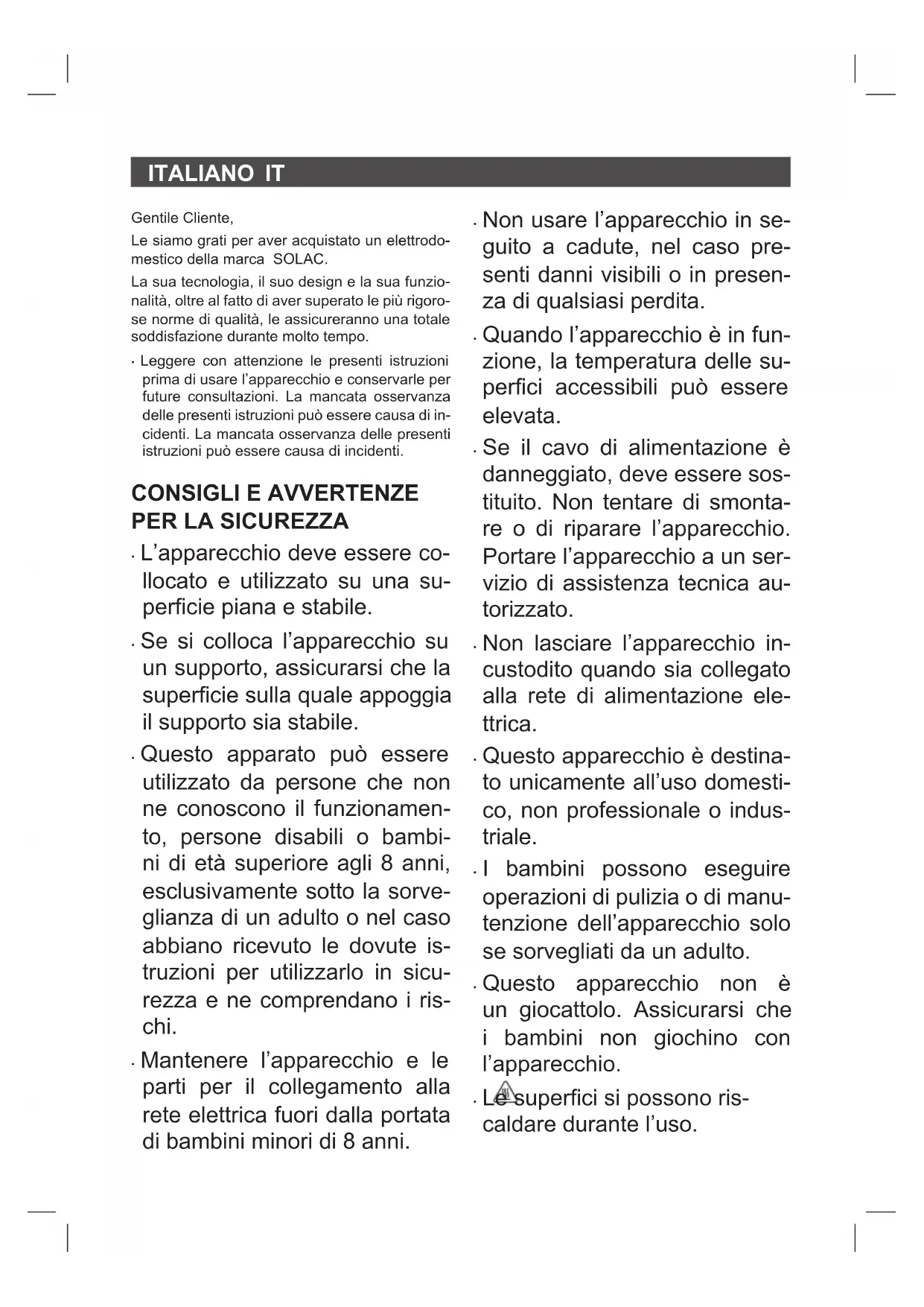 NICA Questo prodotto possiede il riconoscimento e la protezione della garanzia legale di conformità con la legislazione vigente. Per far valere i suoi diritti o interessi, dovrà rivolgersi a uno qualsiasi dei nostri servizi ufciali di assistenza tecnica. Può trovare il più vicino cliccando sul seguente link: http://solac.com Inoltre, può richiedere informazioni mettendosi in contatto con noi. Può scaricare questo manuale di istruzioni e i suoi aggiornamenti da http://solac.com