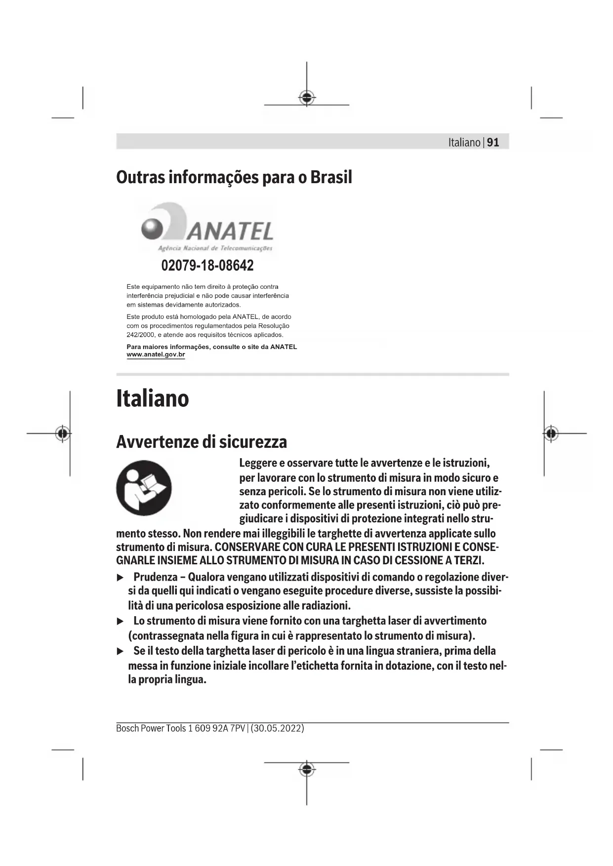 Bosch Power Tools 1 609 92A 7PV | (30.05.2022)98 | Italiano Distanziometro laser digitale GLM 100-25 C GLM 150-27 C Campo di frequenza di funziona- mento 2402–2480MHz 2402–2480MHz Potenza di trasmissione max. 8 mW 8 mW A) Per misurazioni dal lato anteriore dello strumento di misura; vale per un elevato potere riflettente dell’oggetto target (ad es. una parete tinteggiata di bianco), illuminazione di sfondo debole e tem- peratura di funzionamento 25°C; andrà inoltre considerato uno scostamento di ±0,15mm/m in base alla distanza. B) Per misurazioni dal lato anteriore dello strumento di misura; vale per un elevato potere riflettente dell’oggetto target (ad es. una parete tinteggiata di bianco), illuminazione di sfondo intensa, tem- peratura di funzionamento 25°C ed altitudini elevate. Andrà inoltre considerato uno scostamento di ±0,15mm/m in base alla distanza. C) In modalità Misurazione continua, la temperatura di funzionamento max. è di +40 °C. D) Presenza esclusivamente di contaminazioni non conduttive, ma che, in alcune occasioni, possono essere rese temporaneamente conduttive dalla condensa. E) Con temperatura di funzionamento di 25 °C. Tempo di ricarica con caricabatteria USB da 1A. A strumento di misura spento, si otterrà una ricarica più rapida. F) Per ulteriori dati tecnici consultare il seguente indirizzo: https://www.bosch-professional.com/ecodesign G) In caso di dispositivi Bluetooth® con tecnologia Low Energy, con alcuni modelli e sistemi operativi potrebbe non essere possibile stabilire la connessione. I dispositivi Bluetooth® devono supportare il profilo GATT. Per un’identificazione univoca dello strumento di misura, consultare il numero di serie (16) riportato sulla targhetta identificativa. Introduzione/sostituzione della pila