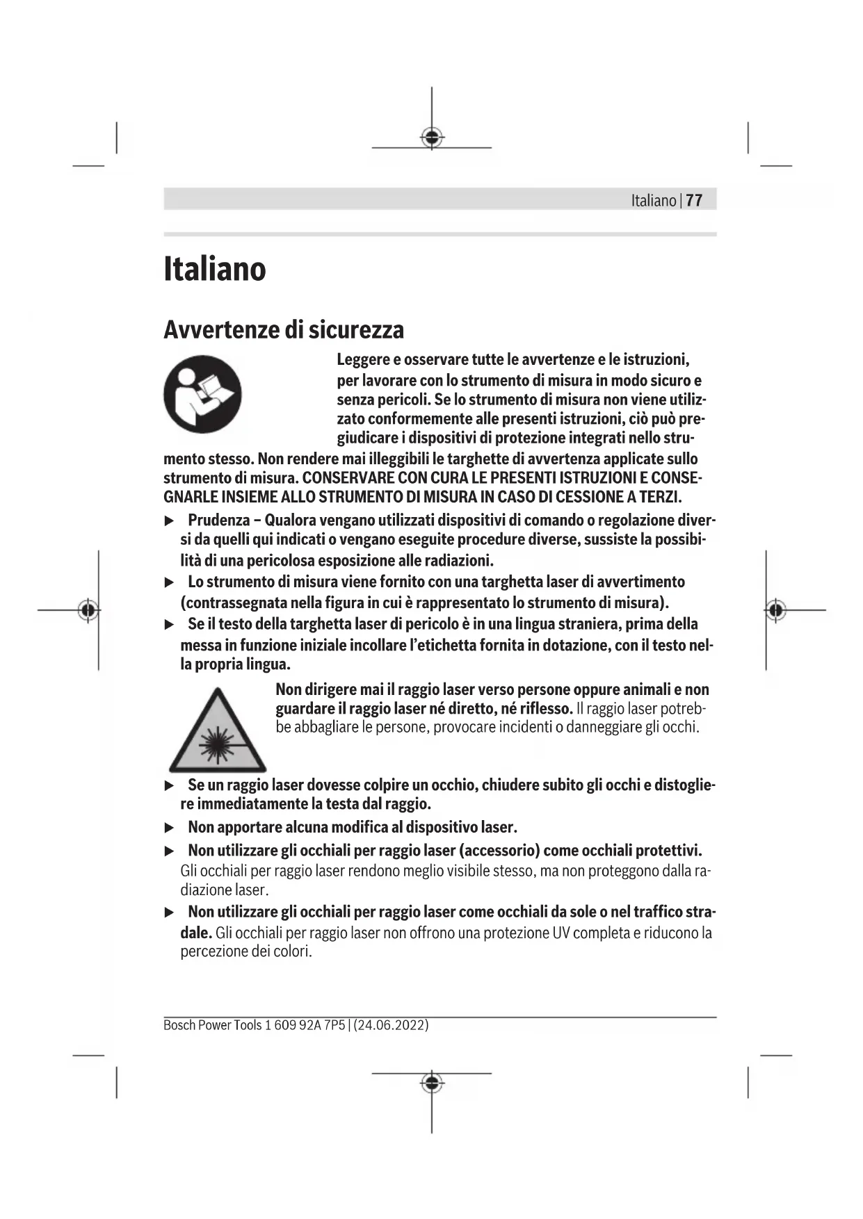 2609120713 (EU) 2609120718 (UK) 1600A013A0 (ARG) 1600A013A1 (MEX) 1 609 92A 7P5 | (24.06.2022) Bosch Power ToolsItaliano | 83 Distanziometro laser di- gitale GLM 50-22 GLM 50-23 G GLM 50-25 G 1600A013A2 (BRL) A) Per misurazioni dal lato anteriore dello strumento di misura; vale per un elevato potere riflettente dell’oggetto target (ad es. una parete tinteggiata di bianco), illuminazione di sfondo debole e tem- peratura di funzionamento 25°C; andrà inoltre considerato uno scostamento di ±0,15mm/m in base alla distanza. B) Per misurazioni dal lato anteriore dello strumento di misura; vale per un elevato potere riflettente dell’oggetto target (ad es. una parete tinteggiata di bianco), illuminazione di sfondo intensa, tem- peratura di funzionamento 25°C ed altitudini elevate. Andrà inoltre considerato uno scostamento di ±0,15mm/m in base alla distanza. C) In modalità Misurazione continua, la temperatura di funzionamento max. è di +40 °C. D) Presenza esclusivamente di contaminazioni non conduttive, ma che, in alcune occasioni, possono essere rese temporaneamente conduttive dalla condensa. E) Per ulteriori dati tecnici consultare il seguente indirizzo: https://www.bosch-professional.com/ecodesign Per un’identificazione univoca dello strumento di misura, consultare il numero di serie (11) riportato sulla targhetta identificativa. Introduzione/sostituzione della pila Sostituire sempre contemporaneamente tutte le pile, o tutte le batterie. Utilizzare esclusivamente pile o batterie dello stesso produttore e della stessa capacità. Prestare attenzione alla corretta polarizzazione, conformemente all’illustrazione ri- portata sul lato interno del vano batterie. u Se lo strumento di misura non viene utilizzato per lunghi periodi, rimuovere le pile o le batterie dallo strumento stesso. In caso di lunghi periodi di magazzinaggio, le pile e le batterie possono subire corrosioni e scaricarsi. Non conservare lo strumento di misura in alcun caso senza avere introdotto il co- perchio vano pile(13) o la batteria al litio(19) (accessorio), soprattutto in ambien- ti polverosi o umidi. Batteria al litio (accessorio) Inserimento/sostituzione della batteria al litio Introdurre la batteria al litio(19) (accessorio). Bosch Power Tools 1 609 92A 7P5 | (24.06.2022)84 | Italiano Per prelevare la batteria al litio(19), premere il bloccaggio(20) ed estrarre la batteria al litio. (vedi Fig. A, Pagina5) Ricarica della batteria al litio (accessorio) u Per la ricarica, utilizzare un alimentatore USB i cui dati tecnici (tensione e corrente di carica) corrispondano a quelli dell’alimentatore consigliato. Attenersi alle istruzioni d’uso dell’alimentatore USB. Per l’alimentatore consigliato, consultare i dati tecnici. u Attenersi alla tensione di rete! La tensione riportata sulla targhetta di identificazione dell’alimentatore deve corrispondere alla tensione della sorgente di alimentazione. Gli alimentatori contrassegnati per l’utilizzo a 230Volt sono utilizzabili anche a 220Volt. A causa delle prescrizioni di trasporto internazionali, le batterie al litio vengono consegnate soltanto parzialmente cariche. Per assicurare la piena potenza della batteria, prima dell’impiego iniziale ricaricarla completamente. Per ulteriori informazioni, visitare il manuale d'istruzioni online: www.bosch-pt.com/manuals Utilizzo Messa in funzione u Non lasciare incustodito lo strumento di misura quando è acceso e spegnerlo sem- pre dopo l’uso. Altre persone potrebbero essere abbagliate dal raggio laser. u Proteggere lo strumento di misura da liquidi e dall’esposizione diretta ai raggi so- lari. u Non esporre lo strumento di misura a temperature o ad oscillazioni termiche estreme. Ad esempio, evitare di lasciarlo per lungo tempo all’interno dell’auto. In caso di forti oscillazioni di temperatura, lasciare che lo strumento di misura raggiunga la nor- male temperatura prima di metterlo in funzione. Temperature oppure sbalzi di tempe- ratura estremi possono pregiudicare la precisione dello strumento di misura. u Evitare di urtare violentemente o di far cadere lo strumento di misura. Qualora lo strumento di misura abbia subito forti influssi esterni, prima di riprendere il lavoro an- drà sempre effettuata una verifica della precisione (vedi «Verifica della precisione», Pa- gina88). 1 609 92A 7P5 | (24.06.2022) Bosch Power ToolsItaliano | 85 Accensione/spegnimento Premere il tasto per accendere lo strumento di misura ed attivare il laser. Lo strumento di misura si può accendere anche senza attivare il laser, premendo il ta- sto . Mantenere premuto il tasto per spegnere lo strumento di misura. I valori e le impostazioni dello strumento presenti in memoria verranno conservati. Procedura di misurazione Alla prima accensione, lo strumento di misura si troverà in modalità Misurazione delle lun- ghezze. Ad ogni successiva accensione, lo strumento di misura si troverà nell’ultima moda- lità utilizzata. Per il piano di riferimento della misurazione, sono disponibili tre diverse impostazioni. (ve- di «Selezione del piano di riferimento», Pagina86) Sistemare lo strumento di misura sul punto iniziale desiderato della misurazione (ad es. su una parete). Acceso lo strumento di misura con il tasto , premere brevemente il tasto per at- tivare il laser. Premere il tasto per avviare la misurazione. Conclusa la misurazione, il raggio laser verrà disattivato. Per eseguire una seconda misu- razione, ripetere tale procedura. È possibile effettuare l’addizione o la sottrazione di valori di misurazione o di risultati fina- li. Per ulteriori informazioni, visitare il manuale d'istruzioni online: www.bosch-pt.com/manuals Lo strumento di misura non andrà spostato durante una misurazione (ad eccezione della modalità Misurazione continua). Lo strumento di misura andrà quindi siste- mato, laddove possibile, su una superficie di riscontro o di appoggio fissa. La lente di ricezione(15) e l’uscita laser(16) non dovranno essere 