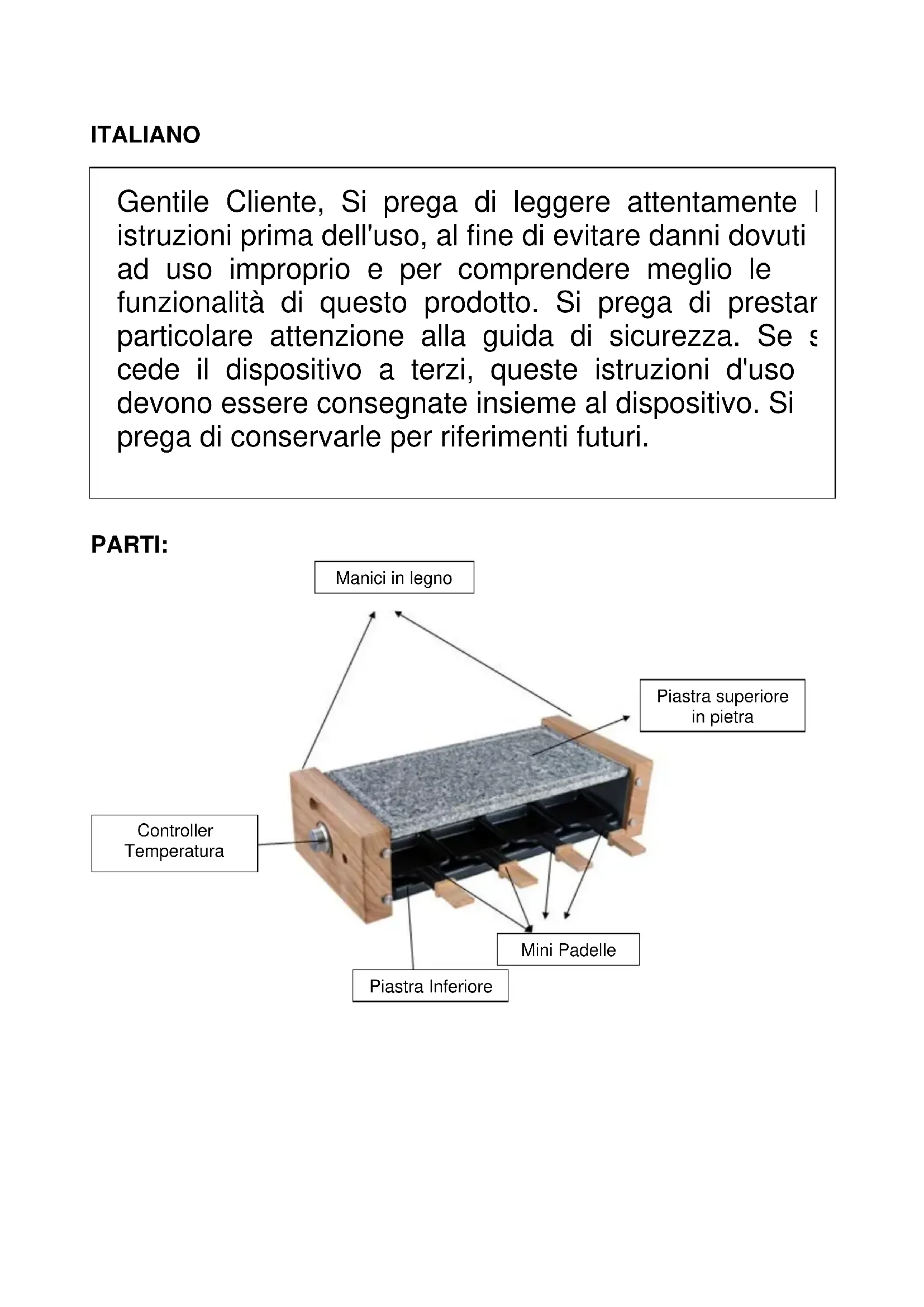 Manici in legno Piastra superiore in pietra Mini Padelle Piastra Inferiore Controller Temperatura Gentile Cliente, Si prega di leggere attentamente le istruzioni prima dell'uso, al fine di evitare danni dovuti ad uso improprio e per comprendere meglio le funzionalità di questo prodotto. Si prega di prestare particolare attenzione alla guida di sicurezza. Se si cede il dispositivo a terzi, queste istruzioni d'uso devono essere consegnate insieme al dispositivo. Si prega di conservarle per riferimenti futuri.MISURE DI SICUREZZA IMPORTANTI