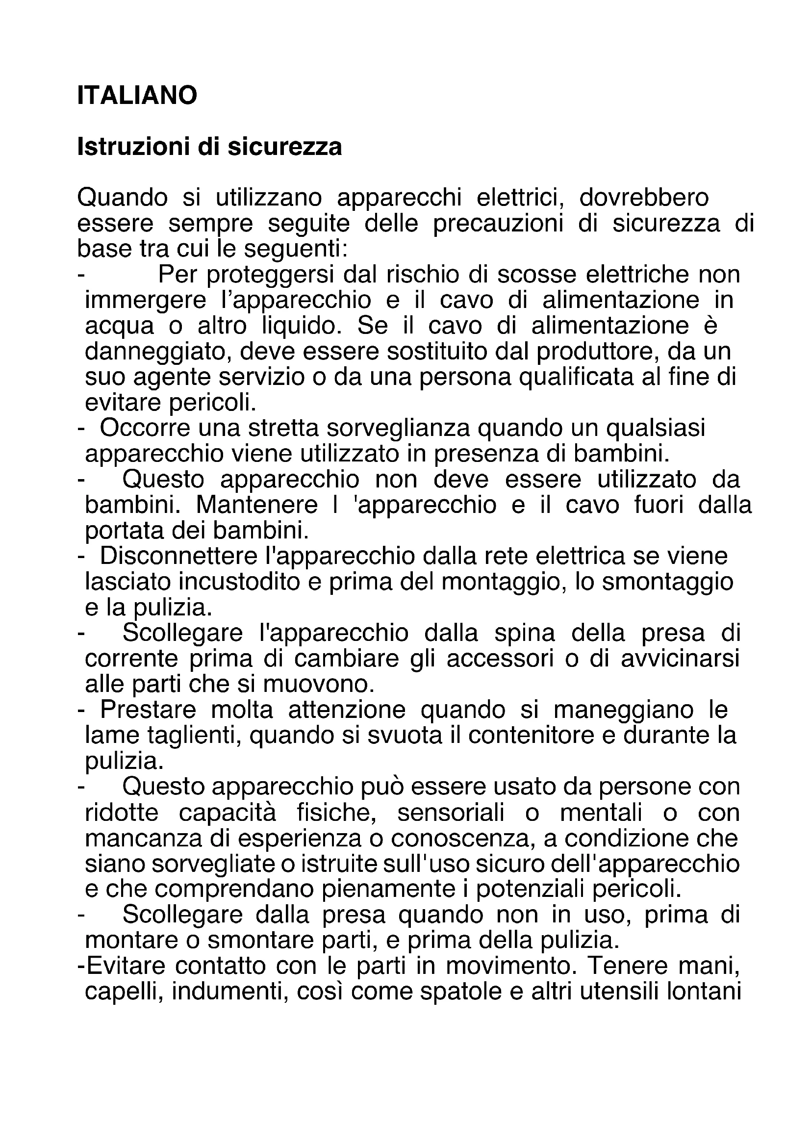 Los dispositivos eléctricos y electrónicos no pueden ser descartado junto con los desechos domésticos. La ley obliga a los consumidores a devolver los dispositivos eléctricos y electrónicos al final de su vida útil a los puntos de recogida públicos establecidos para este propósito o punto de venta. Los detalles de esto están definidos por la ley nacional del país respectivo. Este símbolo en el aparato, el manual de instrucciones o el paquete indica que el aparato está sujeto a estas regulaciones. Al reciclar, reutilizar los materiales u otras formas de usar dispositivos antiguos, está haciendo una contribución importante para proteger nuestro medio ambiente. Adeva SAS / H.Koenig Europe - 8 rue Marc Seguin, 77290 Mitry-Mory, France www.hkoenig.com - https://sac.hkoenig.com - Tél: +33 1 64 67 00 05ITALIANO Istruzioni di sicurezza Quando si utilizzano apparecchi elettrici, dovrebbero essere sempre seguite delle precauzioni di sicurezza di base tra cui le seguenti: - Per proteggersi dal rischio di scosse elettriche non immergere l’apparecchio e il cavo di alimentazione in acqua o altro liquido. Se il cavo di alimentazione è danneggiato, deve essere sostituito dal produttore, da un suo agente servizio o da una persona qualificata al fine di evitare pericoli. - Occorre una stretta sorveglianza quando un qualsiasi apparecchio viene utilizzato in presenza di bambini. - Questo apparecchio non deve essere utilizzato da bambini. Mantenere l 'apparecchio e il cavo fuori dalla portata dei bambini. - Disconnettere l'apparecchio dalla rete elettrica se viene lasciato incustodito e prima del montaggio, lo smontaggio e la pulizia. - Scollegare l'apparecchio dalla spina della presa di corrente prima di cambiare gli accessori o di avvicinarsi alle parti che si muovono. - Prestare molta attenzione quando si maneggiano le lame taglienti, quando si svuota il contenitore e durante la pulizia. - Questo apparecchio può essere usato da persone con ridotte capacità fisiche, sensoriali o mentali o con mancanza di esperienza o conoscenza, a condizione che siano sorvegliate o istruite sull'uso sicuro dell'apparecchio e che comprendano pienamente i potenziali pericoli. - Scollegare dalla presa quando non in uso, prima di montare o smontare parti, e prima della pulizia. - Evitare contatto con le parti in movimento. Tenere mani, capelli, indumenti, così come spatole e altri utensili lontanidurante il funzionamento per ridurre il rischio di lesioni a persone e/o danni al mixer. - Non utilizzare la macchina con un cavo o spina danneggiati, dopo cattivo funzionamento o se l’apparecchio è caduto o si è danneggiato in un qualsiasi modo. Consegnare al più vicino centro di assistenza autorizzato per la verifica, riparazione o regolazione elettrica o meccanica. - L'uso di accessori non raccomandati o venduti dal produttore può provocare incendi, scosse elettriche o lesioni. - Non utilizzare all'aperto. Questo prodotto è solo per uso domestico. - Evitare che il cavo penda dal tavolo o dal banco da lavoro. - Rimuovere le fruste dal mixer prima del lavaggio. - Questo apparecchio può essere utilizzato da bambini di almeno 8 anni di età, purché siano controllati e gli siano state date istruzioni su come usare l’apparecchio in modo sicuro e sono pienamente consapevoli dei pericoli. - La pulizia e manutenzione non devono essere eseguite da bambini a meno che non abbiano almeno 8 anni di età e sono sorvegliati da un adulto. - Mantenere l 'apparecchio e il cavo di alimentazione fuori dalla portata dei bambini sotto gli 8 anni di età. - Quando si utilizzano apparecchiature elettriche, devono sempre essere prese delle misure di sicurezza per prevenire il rischio di incendi, scosse elettriche e/o lesioni in caso di uso improprio. - Assicurarsi che la tensione sulla targhetta corrisponda al voltaggio del vostro impianto. Se così non fosse, contattare il rivenditore e non collegare l'unità. - Conservare il manuale CE per eventuali riferimenti futuri e consegnarlo insieme all’apparecchio ad eventuali futuri utenti.- L’apparecchio è da utilizzaresolo per uso domestico ed interno. - Il vostro apparecchio è stato progettato esclusivamente per un uso domestico. Non è destinato all'uso nelle seguenti situazioni che non sono coperte dalla garanzia: - in cucine per il personale in negozi, uffici e altri ambienti professionali, - in ostelli agricoli, - da ospiti in hotel, motel e altri ambienti residenziali, - in ambienti tipo bed and breakfast.