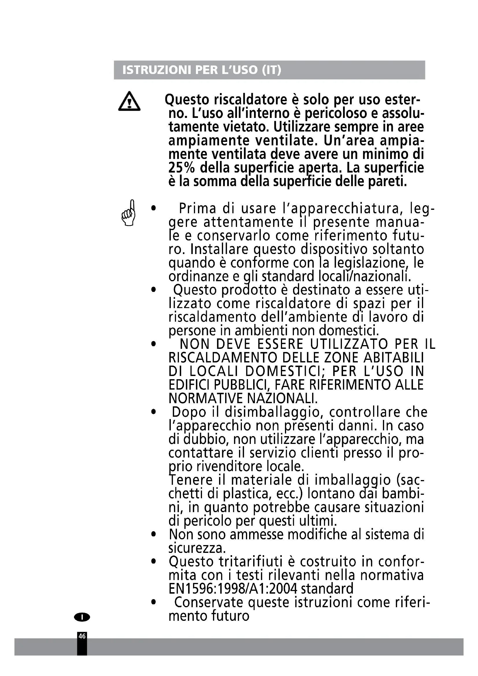 ISTRUZIONI PER L’USO (IT) Questo riscaldatore è solo per uso ester- no. L’uso all’interno è pericoloso e assolu- tamente vietato. Utilizzare sempre in aree ampiamente ventilate. Un’area ampia- mente ventilata deve avere un minimo di 25% della superficie aperta. La superficie è la somma della superficie delle pareti.