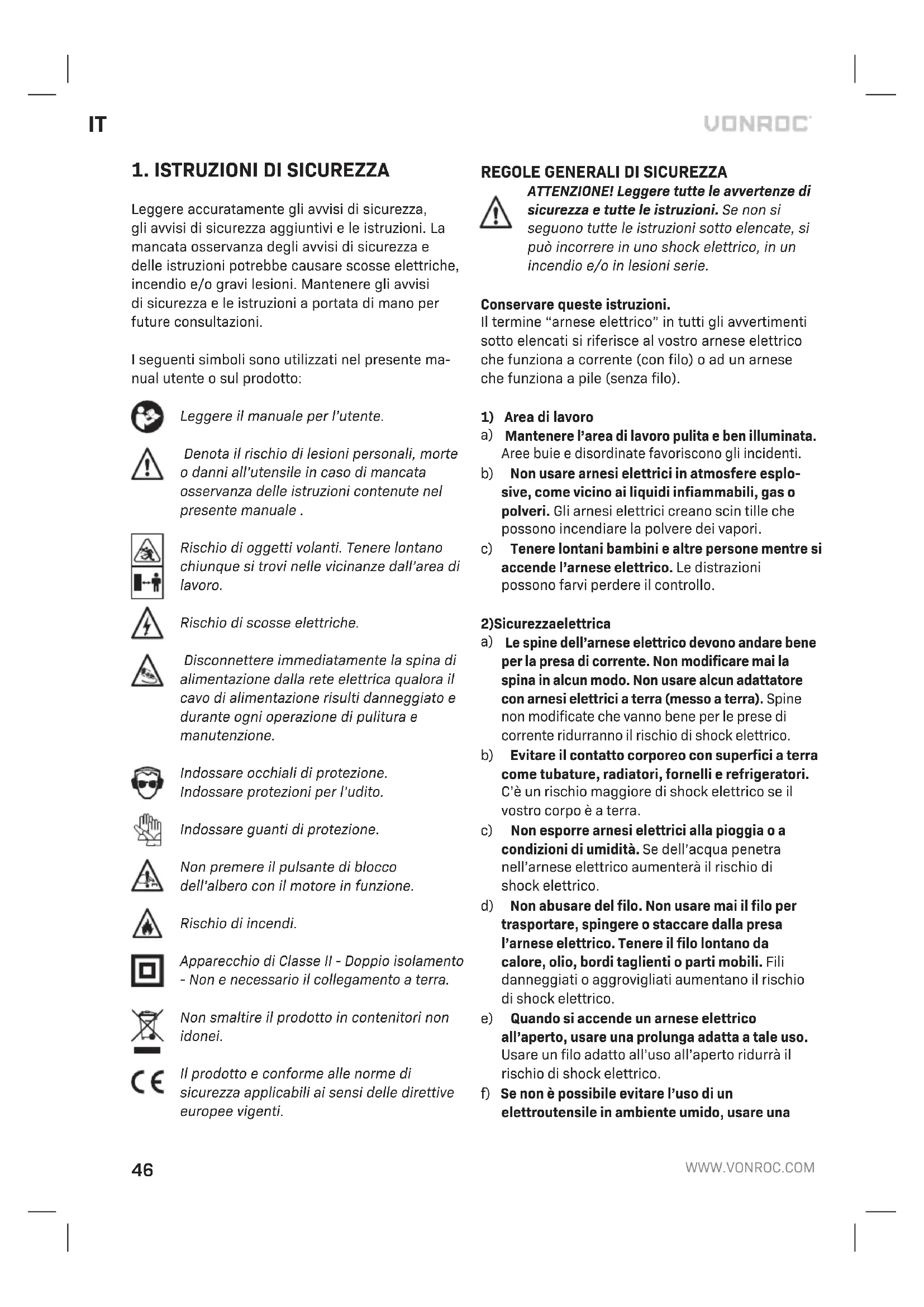 Ciò costituisce l’unica garanzia espressa o implicita fornita dall’azienda. Non esistono altre garanzie espresse o implicite che si estendono oltre il presente documento, ivi comprese le garanzie im- plicite di commerciabilità e idoneità per uno scopo particolare. In nessun caso VONROC sarà responsa- bile di eventuali danni incidentali o consequenziali. I rimedi dei rivenditori saranno limitati alla ripara- zione o sostituzione di unità o parti non conformi. Il prodotto e il manuale per l’utente sono soggetti a modifiche. I dati tecnici possono essere modificati senza ulteriore notifica.
