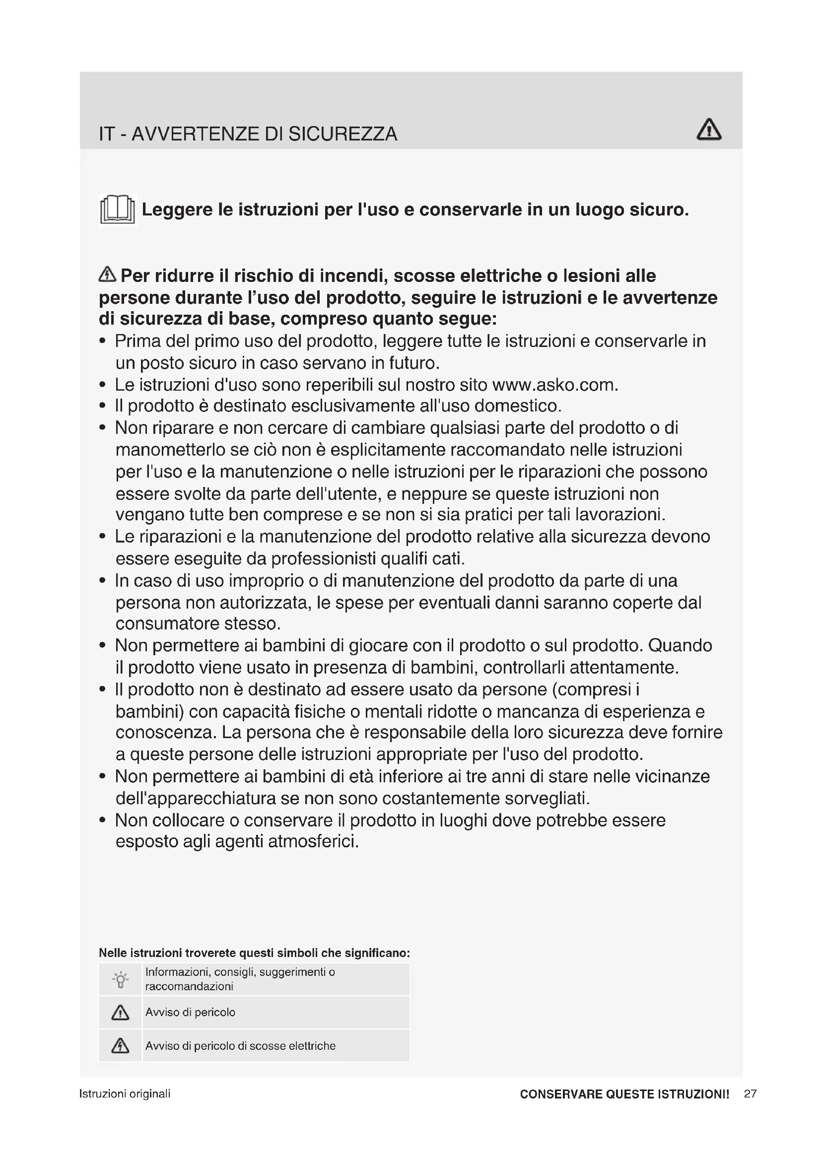 - Le istruzioni d'uso sono reperibili sul nostro sito www.asko.com.