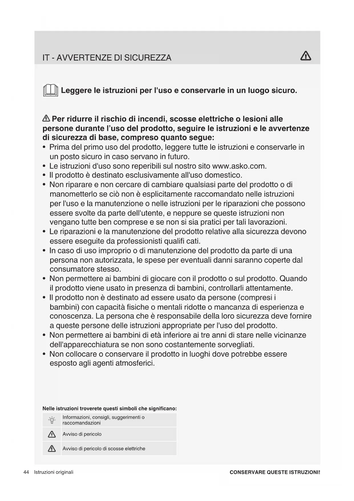 - Non collocare o conservare il prodotto in luoghi dove potrebbe essere esposto agli agenti atmosferici. Istruzioni originali CONSERVARE QUESTE ISTRUZIONI! Nelle istruzioni troverete questi simboli che significano: Informazioni, consigli, suggerimenti o raccomandazioni Avviso di pericolo Avviso di pericolo di scosse elettriche45 Questo accessorio può essere utilizzato solamente con lavatrici e asciugartici ASKO.