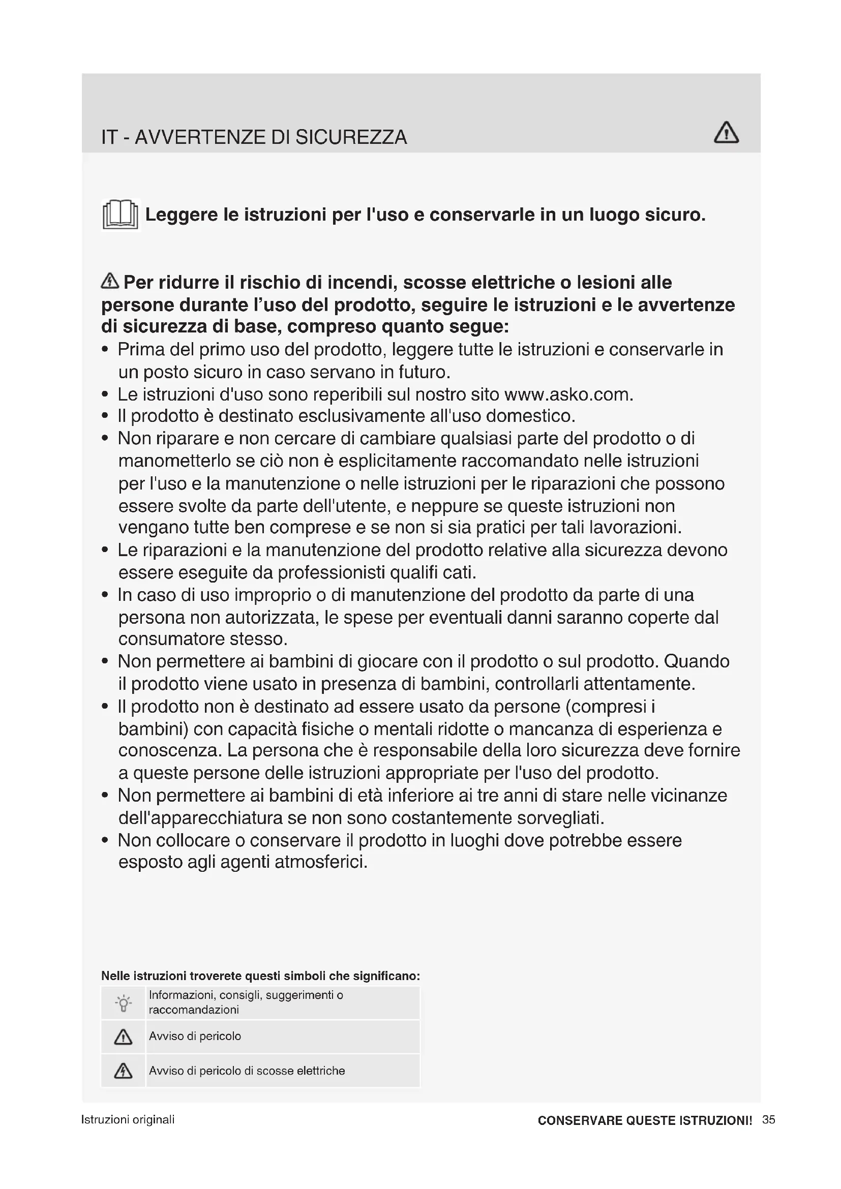 - Le istruzioni d'uso sono reperibili sul nostro sito www.asko.com.