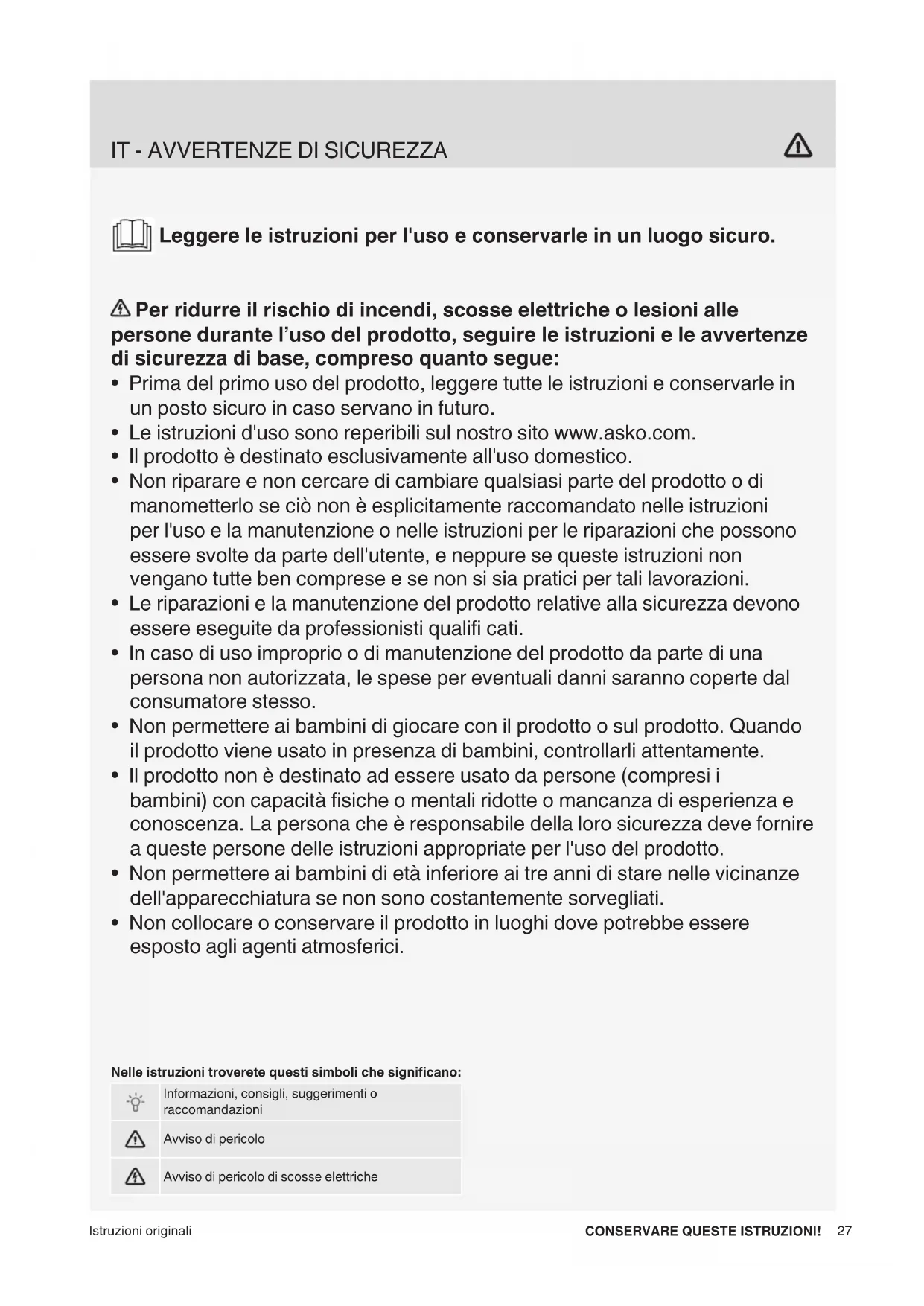 - Le istruzioni d'uso sono reperibili sul nostro sito www.asko.com.