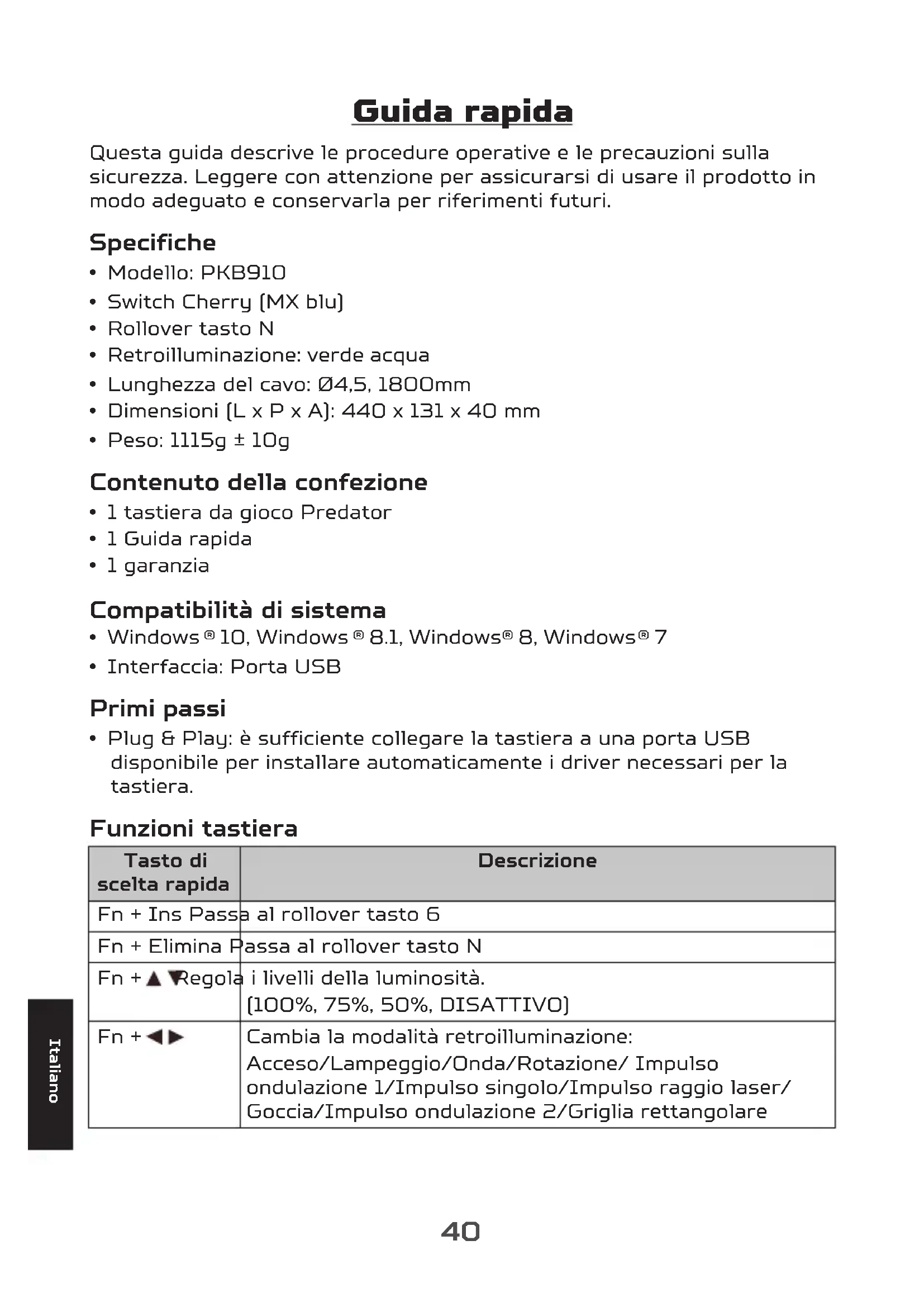 - Plug & Play: è sufficiente collegare la tastiera a una porta USB disponibile per installare automaticamente i driver necessari per la tastiera. Funzioni tastiera Tasto di scelta rapida Descrizione Fn + Ins Passa al rollover tasto 6 Fn + Elimina Passa al rollover tasto N Fn + Regola i livelli della luminosità. (100%, 75%, 50%, DISATTIVO) Fn + Cambia la modalità retroilluminazione: Acceso/Lampeggio/Onda/Rotazione/ Impulso ondulazione 1/Impulso singolo/Impulso raggio laser/ Goccia/Impulso ondulazione 2/Griglia rettangolare41 Italiano Tasto di scelta rapida Descrizione Fn + Home Registrazione immediata di macro Fase 1: Premere Fn + F6. Attivare il blocco tasti Windows. Fase 2: Premere Fn + Home, il LED inizia a lampeggiare. Fase 3: Assegnare un tasto di cui salvare la macro, il LED lampeggia più rapidamente. Fase 4: Digitare il tasto nell'elenco macro. Fase 5: Premere Fn + Home, la registrazione immediata della macro è terminata. Il processo di registrazione viene terminato se non vengono eseguite azioni entro 20 secondi. Linee guida sul comfort Alcune ricerche hanno suggerito che lunghi periodi di movimento ripetitivo, l'utilizzo di uno spazio operativo improprio, la posizione del corpo e le cattive abitudini di lavoro possono causare disagio fisico e lesioni a nervi, tendini e muscoli. Di seguito alcune linee guida per l'ottimizzazione del comfort durante l'uso e per evitare lesioni.