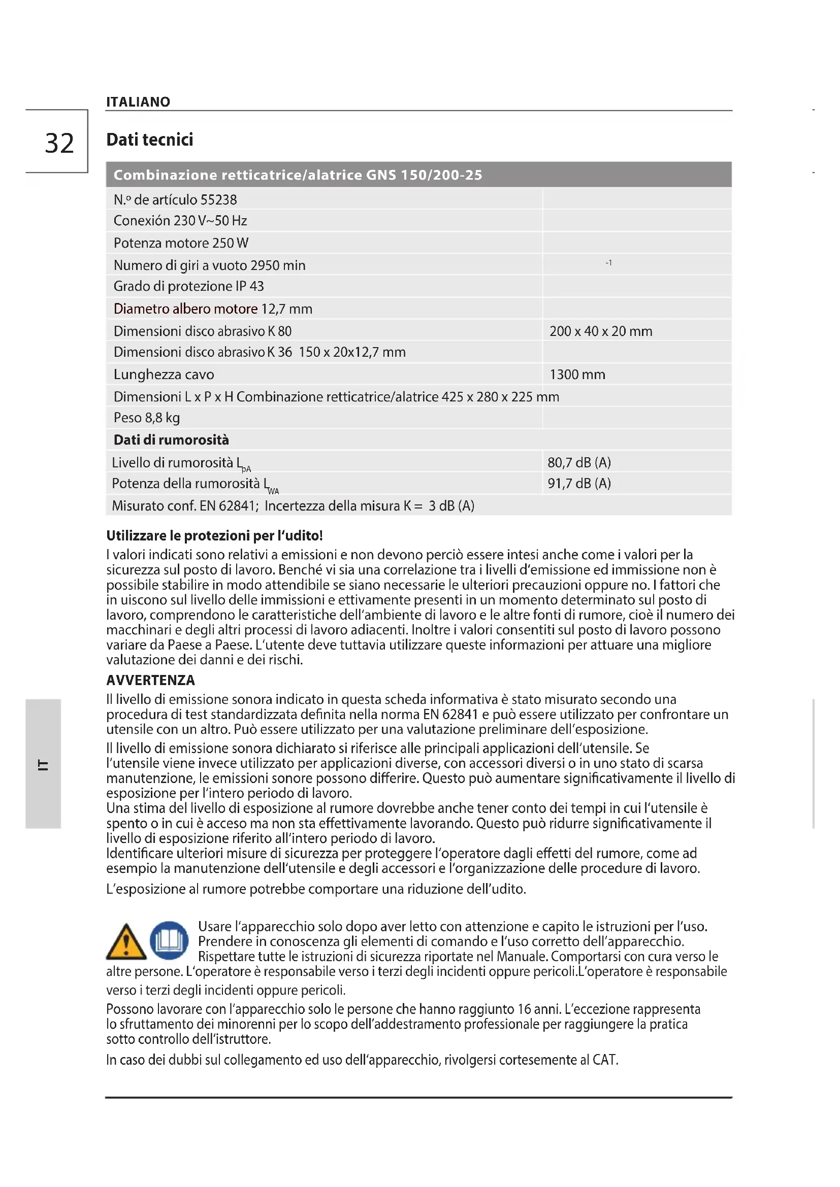 91,7 dB (A) Misurato conf. EN 62841; Incertezza della misura K = 3 dB (A) Utilizzare le protezioni per l‘udito! I valori indicati sono relativi a emissioni e non devono perciò essere intesi anche come i valori per la sicurezza sul posto di lavoro. Benché vi sia una correlazione tra i livelli d‘emissione ed immissione non è possibile stabilire in modo attendibile se siano necessarie le ulteriori precauzioni oppure no. I fattori che in uiscono sul livello delle immissioni e ettivamente presenti in un momento determinato sul posto di lavoro, comprendono le caratteristiche dell‘ambiente di lavoro e le altre fonti di rumore, cioè il numero dei macchinari e degli altri processi di lavoro adiacenti. Inoltre i valori consentiti sul posto di lavoro possono variare da Paese a Paese. L‘utente deve tuttavia utilizzare queste informazioni per attuare una migliore valutazione dei danni e dei rischi. AVVERTENZA Il livello di emissione sonora indicato in questa scheda informativa è stato misurato secondo una procedura di test standardizzata denita nella norma EN 62841 e può essere utilizzato per confrontare un utensile con un altro. Può essere utilizzato per una valutazione preliminare dell‘esposizione. Il livello di emissione sonora dichiarato si riferisce alle principali applicazioni dell‘utensile. Se l‘utensile viene invece utilizzato per applicazioni diverse, con accessori diversi o in uno stato di scarsa manutenzione, le emissioni sonore possono dierire. Questo può aumentare signicativamente il livello di esposizione per l‘intero periodo di lavoro. Una stima del livello di esposizione al rumore dovrebbe anche tener conto dei tempi in cui l‘utensile è spento o in cui è acceso ma non sta eettivamente lavorando. Questo può ridurre signicativamente il livello di esposizione riferito all‘intero periodo di lavoro. Identicare ulteriori misure di sicurezza per proteggere l‘operatore dagli eetti del rumore, come ad esempio la manutenzione dell‘utensile e degli accessori e l‘organizzazione delle procedure di lavoro. L’esposizione al rumore potrebbe comportare una riduzione dell’udito. Usare l‘apparecchio solo dopo aver letto con attenzione e capito le istruzioni per l‘uso. Prendere in conoscenza gli elementi di comando e l’uso corretto dell’apparecchio. Rispettare tutte le istruzioni di sicurezza riportate nel Manuale. Comportarsi con cura verso le altre persone. L‘operatore è responsabile verso i terzi degli incidenti oppure pericoli.L‘operatore è responsabile verso i terzi degli incidenti oppure pericoli. Possono lavorare con l‘apparecchiosolo le persone che hannoraggiunto 16 anni. L’eccezionerappresenta lo sfruttamento deiminorenni per lo scopodell’addestramento professionaleper raggiungere la pratica sottocontrollo dell‘istruttore. In caso dei dubbi sul collegamento ed uso dell‘apparecchio, rivolgersi cortesemente al CAT. ITALIANO33