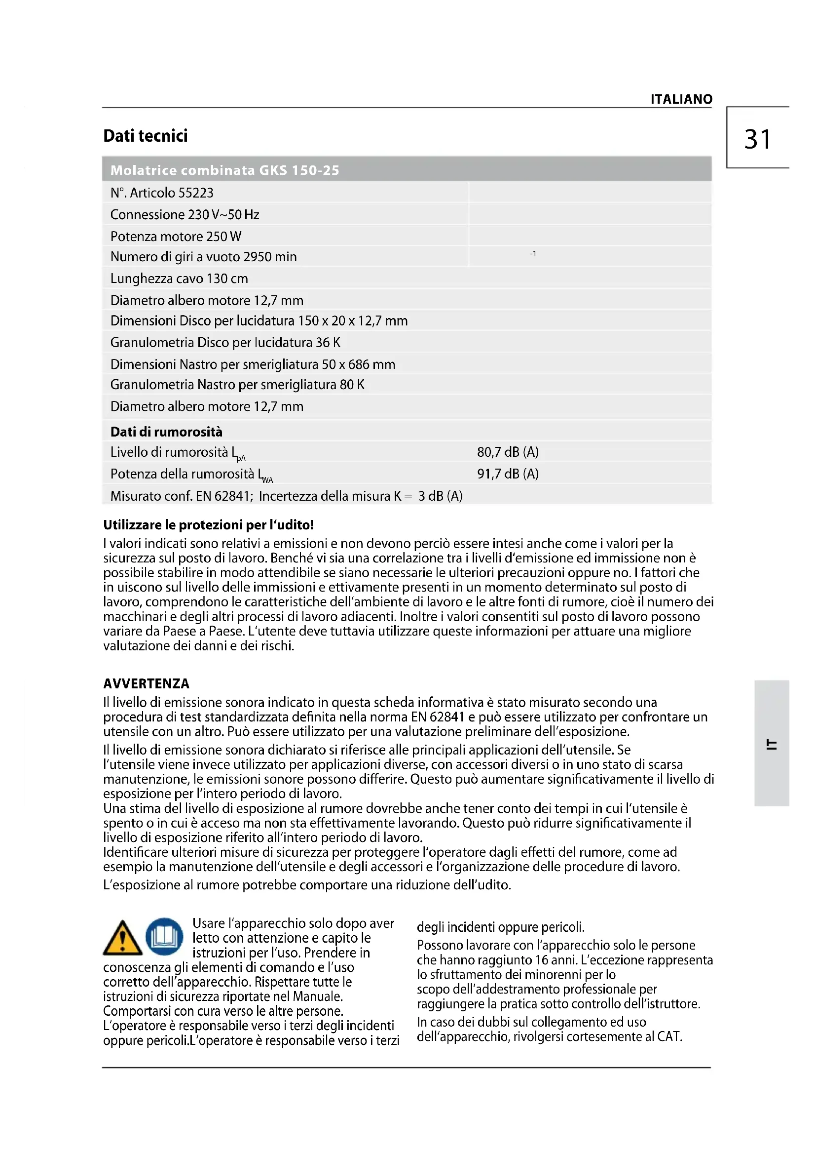 91,7 dB (A) Misurato conf. EN 62841; Incertezza della misura K = 3 dB (A) Utilizzare le protezioni per l‘udito! I valori indicati sono relativi a emissioni e non devono perciò essere intesi anche come i valori per la sicurezza sul posto di lavoro. Benché vi sia una correlazione tra i livelli d‘emissione ed immissione non è possibile stabilire in modo attendibile se siano necessarie le ulteriori precauzioni oppure no. I fattori che in uiscono sul livello delle immissioni e ettivamente presenti in un momento determinato sul posto di lavoro, comprendono le caratteristiche dell‘ambiente di lavoro e le altre fonti di rumore, cioè il numero dei macchinari e degli altri processi di lavoro adiacenti. Inoltre i valori consentiti sul posto di lavoro possono variare da Paese a Paese. L‘utente deve tuttavia utilizzare queste informazioni per attuare una migliore valutazione dei danni e dei rischi. AVVERTENZA Il livello di emissione sonora indicato in questa scheda informativa è stato misurato secondo una procedura di test standardizzata denita nella norma EN 62841 e può essere utilizzato per confrontare un utensile con un altro. Può essere utilizzato per una valutazione preliminare dell‘esposizione. Il livello di emissione sonora dichiarato si riferisce alle principali applicazioni dell‘utensile. Se l‘utensile viene invece utilizzato per applicazioni diverse, con accessori diversi o in uno stato di scarsa manutenzione, le emissioni sonore possono dierire. Questo può aumentare signicativamente il livello di esposizione per l‘intero periodo di lavoro. Una stima del livello di esposizione al rumore dovrebbe anche tener conto dei tempi in cui l‘utensile è spento o in cui è acceso ma non sta eettivamente lavorando. Questo può ridurre signicativamente il livello di esposizione riferito all‘intero periodo di lavoro. Identicare ulteriori misure di sicurezza per proteggere l‘operatore dagli eetti del rumore, come ad esempio la manutenzione dell‘utensile e degli accessori e l‘organizzazione delle procedure di lavoro. L’esposizione al rumore potrebbe comportare una riduzione dell’udito. Usare l‘apparecchio solo dopo aver letto con attenzione e capito le istruzioni per l‘uso. Prendere in conoscenza gli elementi di comando e l’uso corretto dell’apparecchio. Rispettare tutte le istruzioni di sicurezza riportate nel Manuale. Comportarsi con cura verso le altre persone. L‘operatore è responsabile verso i terzi degli incidenti oppure pericoli.L‘operatore è responsabile verso i terzi degli incidenti oppure pericoli. Possono lavorare con l‘apparecchiosolo le persone che hannoraggiunto 16 anni. L’eccezionerappresenta lo sfruttamento deiminorenni per lo scopodell’addestramento professionaleper raggiungere la pratica sottocontrollo dell‘istruttore. In caso dei dubbi sul collegamento ed uso dell‘apparecchio, rivolgersi cortesemente al CAT. ITALIANO32