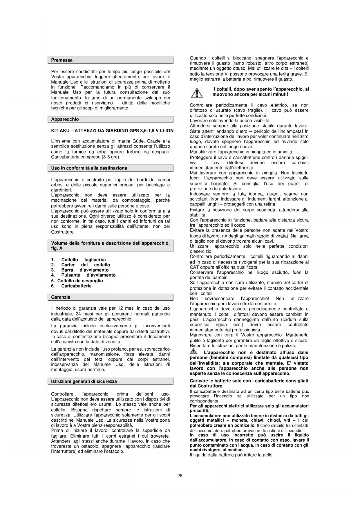 Garanzia Il periodo di garanzia vale per 12 mesi in caso dell’uso industriale, 24 mesi per gli acquirenti normali partendo dalla data dell’acquisto dell’apparecchio. La garanzia include esclusivamente gli inconvenienti dovuti dal difetto del materiale oppure dai difetti costruttivi. In caso di contestazione bisogna presentare il documento sull’acquisto con la data di vendita. La garanzia non include l’uso profano, per es. sovraccarico dell’apparecchio, manomissione, forza elevata, danni dall’intervento dei terzi oppure dai corpi estranei, inosservanza del Manuale Uso, delle istruzioni di montaggio, usura normale. Istruzioni generali di sicurezza Controllare l’apparecchio prima dell’ogni uso. L’apparecchio non deve essere utilizzato con i dispositivi di sicurezza difettosi e/o usurati. Lo stesso vale anche per coltello. Bisogna rispettare sempre le istruzioni di sicurezza. Utilizzare l’apparecchio solamente per gli scopi descritti nel Manuale Uso. La sicurezza nella Vostra zona di lavoro è a Vostra piena responsabilità. Prima di iniziare il lavoro, controllare la superficie da tagliare. Eliminare tutti i corpi estranei i cui troverete. Attendersi agli stessi anche durante il lavoro. In caso che trovereste un ostacolo, spegnere l’apparecchio (lasciare l’interruttore) ed eliminare l’ostacolo. Quando i coltelli si bloccano, spegnere l’apparecchio e rimuovere il guasto (ramo robusto, altro corpo estraneo) mediante un oggetto ottuso. Mai utilizzare le dita – i coltelli sotto la tensione Vi possono provocare una ferita grave. E’ meglio estrarre la batteria e poi rimuovere il guasto. I coltelli, dopo aver spento l’apparecchio, si muovono ancora per alcuni minuti! Controllare periodicamente il cavo elettrico, se non difettoso o usurato (cavo fragile). Il cavo può essere utilizzato solo nelle perfette condizioni. Lavorare solo avendo la buona visibilità. Attendersi sempre alla posizione stabile durante lavoro. Siate attenti andando dietro – pericolo dell’inciampata! In caso d’interruzione del lavoro per voler continuare nell’altro luogo, dovete spegnere l’apparecchio ed avviarlo solo quando sarete nel luogo nuovo. Mai utilizzare l’apparecchio in pioggia ed in umidità. Proteggere il cavo e caricabatterie contro i danni e spigoli