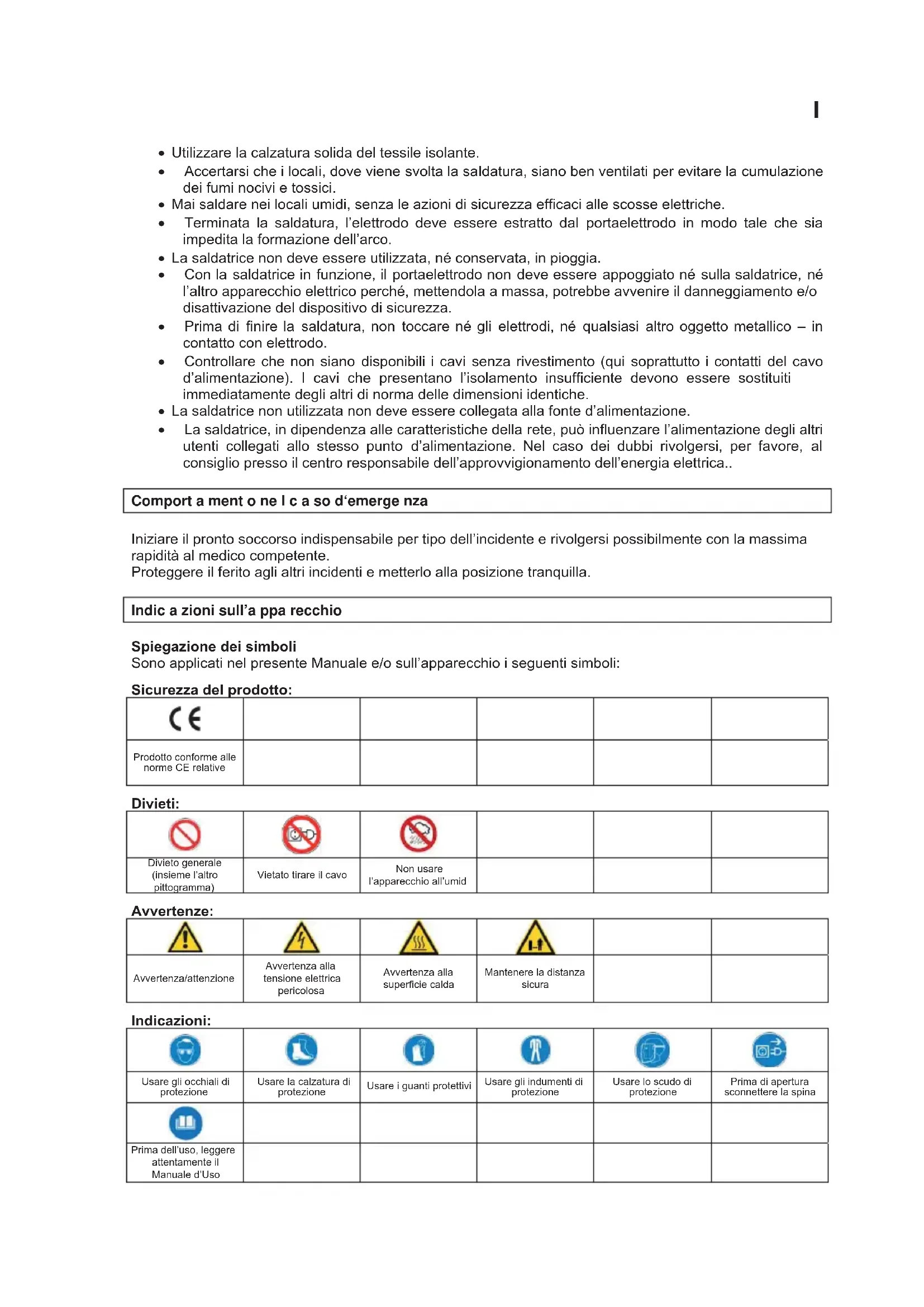 (IILFDFLWpGHODVRXUFHGµDOLPHQWDWLRQGHVRXGXUHI x Utilizzare la calzatura solida del tessile isolante. x Accertarsi che i locali, dove viene svolta la saldatura, siano ben ventilati per evitare la cumulazione dei fumi nocivi e tossici. x Mai saldare nei locali umidi, senza le azioni di sicurezza efficaci alle scosse elettriche. x Terminata la saldatura, l’elettrodo deve essere estratto dal portaelettrodo in modo tale che sia impedita la formazione dell’arco. x La saldatrice non deve essere utilizzata, né conservata, in pioggia. x Con la saldatrice in funzione, il portaelettrodo non deve essere appoggiato né sulla saldatrice, né l’altro apparecchio elettrico perché, mettendola a massa, potrebbe avvenire il danneggiamento e/o disattivazione del dispositivo di sicurezza. x Prima di finire la saldatura, non toccare né gli elettrodi, né qualsiasi altro oggetto metallico – in contatto con elettrodo. x Controllare che non siano disponibili i cavi senza rivestimento (qui soprattutto i contatti del cavo d’alimentazione). I cavi che presentano l’isolamento insufficiente devono essere sostituiti immediatamente degli altri di norma delle dimensioni identiche. x La saldatrice non utilizzata non deve essere collegata alla fonte d’alimentazione. x La saldatrice, in dipendenza alle caratteristiche della rete, può influenzare l’alimentazione degli altri utenti collegati allo stesso punto d’alimentazione. Nel caso dei dubbi rivolgersi, per favore, al consiglio presso il centro responsabile dell’approvvigionamento dell’energia elettrica.. Comport a ment o ne l c a so d‘emerge nza Iniziare il pronto soccorso indispensabile per tipo dell’incidente e rivolgersi possibilmente con la massima rapidità al medico competente. Proteggere il ferito agli altri incidenti e metterlo alla posizione tranquilla. Indic a zioni sull’a ppa recchio Spiegazione dei simboli Sono applicati nel presente Manuale e/o sull’apparecchio i seguenti simboli: Sicurezza del prodotto: Prodotto conforme alle norme CE relative Divieti: Divieto generale (insieme l’altro pittogramma) Vietato tirare il cavo Non usare l’apparecchio all’umid Avvertenze: Avvertenza/attenzione Avvertenza alla tensione elettrica pericolosa Avvertenza alla superficie calda Mantenere la distanza sicura Indicazioni: Usare gli occhiali di protezione Usare la calzatura di protezione Usare i guanti protettivi Usare gli indumenti di protezione Usare lo scudo di protezione Prima di apertura sconnettere la spina Prima dell’uso, leggere attentamente il Manuale d’UsoI Tutela dell’ambiente: