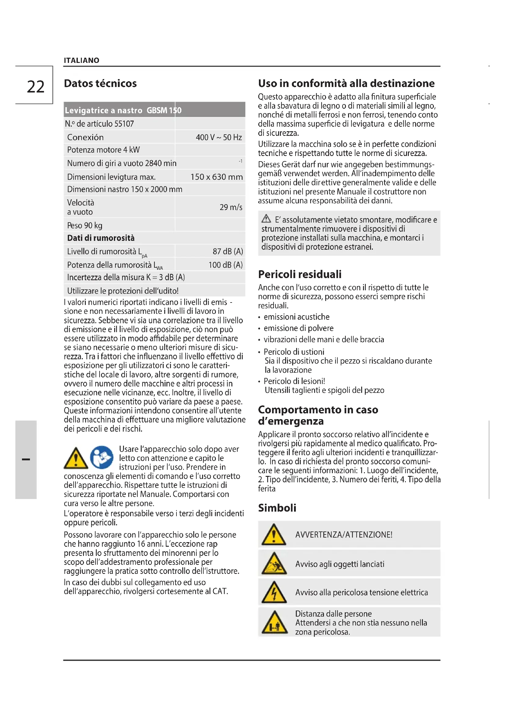 opodell’addestramento professionaleper raggiungere la pratica sottocontrollo dell‘istruttore. In caso dei dubbi sul collegamento ed uso dell‘apparecchio, rivolgersi cortesemente al CAT. Uso in conformità alla destinazione Questo apparecchio è adatto alla nitura superciale e alla sbavatura di legno o di materiali simili al legno, nonché di metalli ferrosi e non ferrosi, tenendo conto della massima supercie di levigatura e delle norme di sicurezza. Utilizzare la macchina solo se è in perfette condizioni tecniche e rispettando tutte le norme di sicurezza. Dieses Gerät darf nur wie angegeben bestimmungs