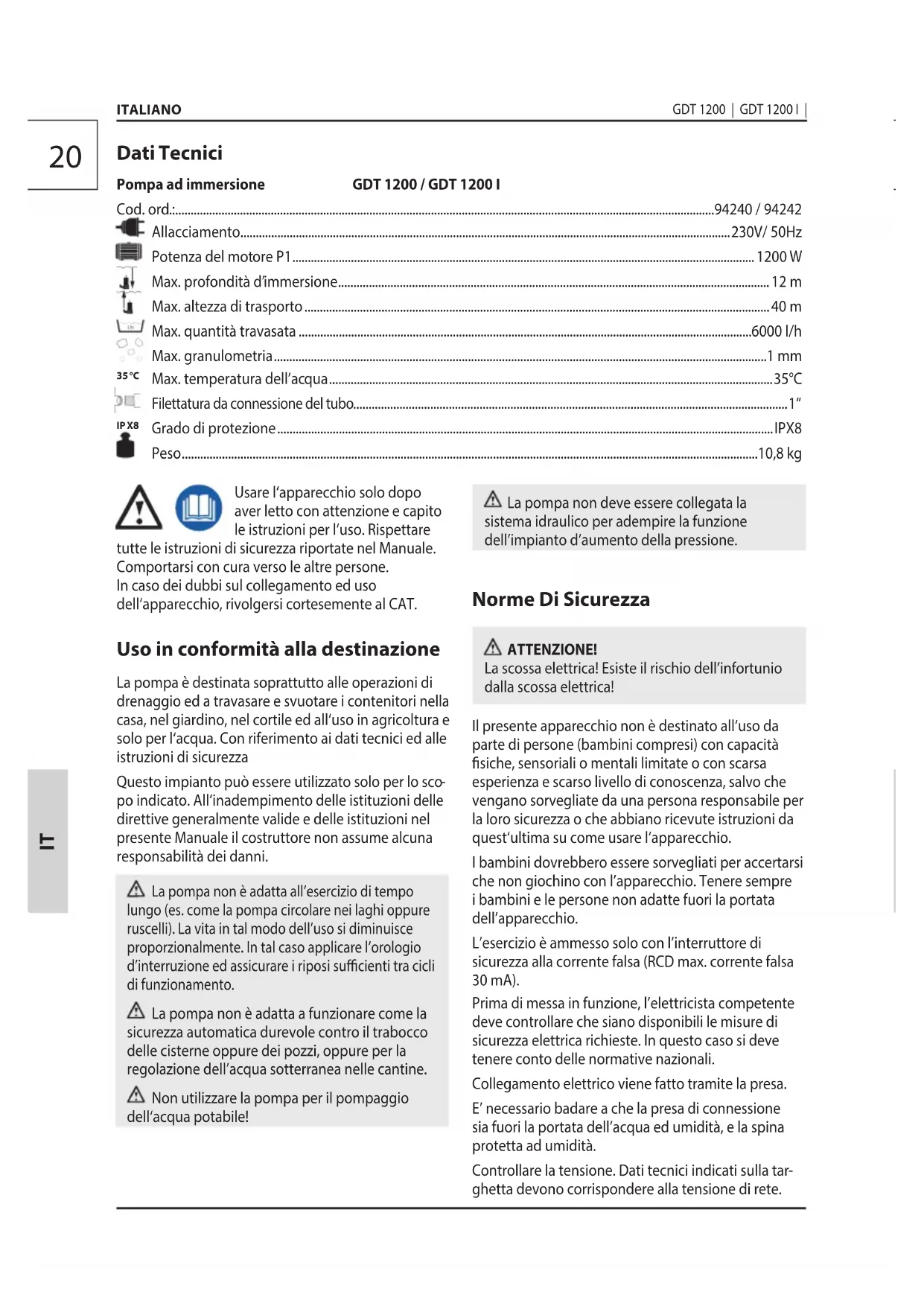po indicato. All‘inadempimento delle istituzioni delle direttive generalmente valide e delle istituzioni nel presente Manuale il costruttore non assume alcuna responsabilità dei danni. La pompa non è adatta all’esercizio di tempo lungo (es. come la pompa circolare nei laghi oppure ruscelli). La vita in tal modo dell’uso si diminuisce proporzionalmente. In tal caso applicare l’orologio d’interruzione ed assicurare i riposi sucienti tra cicli di funzionamento. La pompa non è adatta a funzionare come la sicurezza automatica durevole contro il trabocco delle cisterne oppure dei pozzi, oppure per la regolazione dell’acqua sotterranea nelle cantine. Non utilizzare la pompa per il pompaggio dell‘acqua potabile! Dati Tecnici Pompa ad immersione GDT 1200 / GDT 1200 I Cod. ord.: ...............................................................................................................................................................................94240 / 94242 Allacciamento...............................................................................................................................................................230V/ 50Hz Potenza del motore P1 ......................................................................................................................................................1200 W Max. profondità d’immersione ............................................................................................................................................ 12 m Max. altezza di trasporto ....................................................................................................................................................... 40 m Max. quantità travasata ...................................................................................................................................................6000 l/h Max. granulometria ................................................................................................................................................................1 mm Max. temperatura dell’acqua ................................................................................................................................................ 35°C Filettatura da connessione del tubo ............................................................................................................................................. 1“ Grado di protezione ................................................................................................................................................................. IPX8 Peso ...........................................................................................................................................................................................10,8 kg La pompa non deve essere collegata la sistema idraulico per adempire la funzione dell’impianto d’aumento della pressione. Norme Di Sicurezza ATTENZIONE! La scossa elettrica! Esiste il rischio dell’infortunio dalla scossa elettrica! Il presente apparecchio non è destinato all‘uso da parte di persone (bambini compresi) con capacità siche, sensoriali o mentali limitate o con scarsa esperienza e scarso livello di conoscenza, salvo che vengano sorvegliate da una persona responsabile per la loro sicurezza o che abbiano ricevute istruzioni da quest‘ultima su come usare l‘apparecchio. I bambini dovrebbero essere sorvegliati per accertarsi che non giochino con l’apparecchio. Tenere sempre i bambini e le persone non adatte fuori la portata dell’apparecchio. L’esercizio è ammesso solo con l’interruttore di sicurezza alla corrente falsa (RCD max. corrente falsa 30 mA). Prima di messa in funzione, l’elettricista competente deve controllare che siano disponibili le misure di sicurezza elettrica richieste. In questo caso si deve tenere conto delle normative nazionali. Collegamento elettrico viene fatto tramite la presa. E’ necessario badare a che la presa di connessione sia fuori la portata dell’acqua ed umidità, e la spina protetta ad umidità. Controllare la tensione. Dati tecnici indicati sulla tar