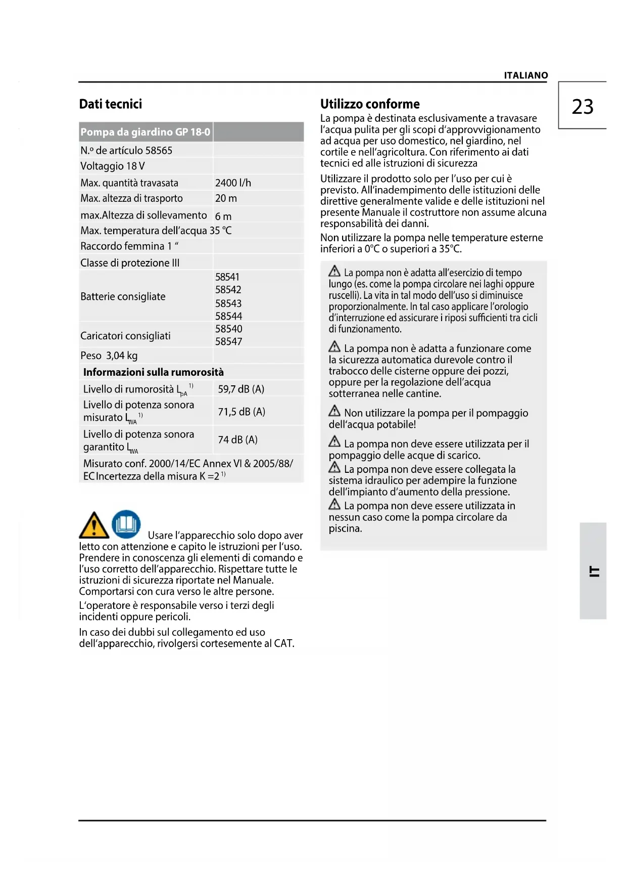 Usare l‘apparecchio solo dopo aver letto con attenzione e capito le istruzioni per l‘uso. Prendere in conoscenza gli elementi di comando e l’uso corretto dell’apparecchio. Rispettare tutte le istruzioni di sicurezza riportate nel Manuale. Comportarsi con cura verso le altre persone. L‘operatore è responsabile verso i terzi degli incidenti oppure pericoli. In caso dei dubbi sul collegamento ed uso dell‘apparecchio, rivolgersi cortesemente al CAT. Utilizzo conforme La pompa è destinata esclusivamente a travasare l‘acqua pulita per gli scopi d‘approvvigionamento ad acqua per uso domestico, nel giardino, nel cortile e nell‘agricoltura. Con riferimento ai dati tecnici ed alle istruzioni di sicurezza Utilizzare il prodotto solo per l’uso per cui è previsto. All‘inadempimento delle istituzioni delle direttive generalmente valide e delle istituzioni nel presente Manuale il costruttore non assume alcuna responsabilità dei danni. Non utilizzare la pompa nelle temperature esterne inferiori a 0°C o superiori a 35°C. La pompa non è adatta all’esercizio di tempo lungo (es. come la pompa circolare nei laghi oppure ruscelli). La vita in tal modo dell’uso si diminuisce proporzionalmente. In tal caso applicare l’orologio d’interruzione ed assicurare i riposi sucienti tra cicli di funzionamento. La pompa non è adatta a funzionare come la sicurezza automatica durevole contro il trabocco delle cisterne oppure dei pozzi, oppure per la regolazione dell’acqua sotterranea nelle cantine. Non utilizzare la pompa per il pompaggio dell‘acqua potabile! La pompa non deve essere utilizzata per il pompaggio delle acque di scarico. La pompa non deve essere collegata la sistema idraulico per adempire la funzione dell’impianto d’aumento della pressione. La pompa non deve essere utilizzata in nessun caso come la pompa circolare da piscina.D