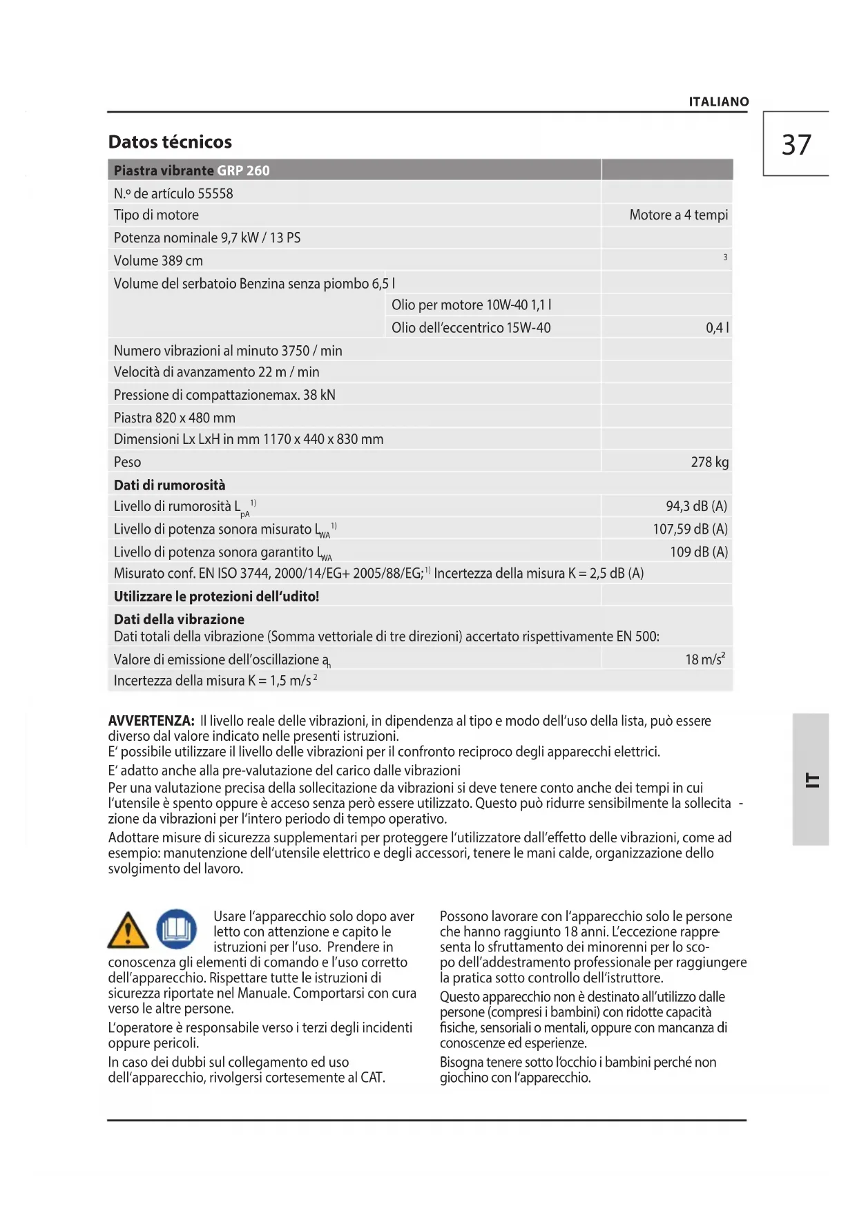 Volume del serbatoio Benzina senza piombo 6,5 l Olio per motore 10W-40 1,1 l Olio dell’eccentrico 15W-40 0,4 l Numero vibrazioni al minuto 3750 / min Velocità di avanzamento 22 m / min Pressione di compattazionemax. 38 kN Piastra 820 x 480 mm Dimensioni Lx LxH in mm 1170 x 440 x 830 mm Peso 278 kg Dati di rumorosità Livello di rumorosità L