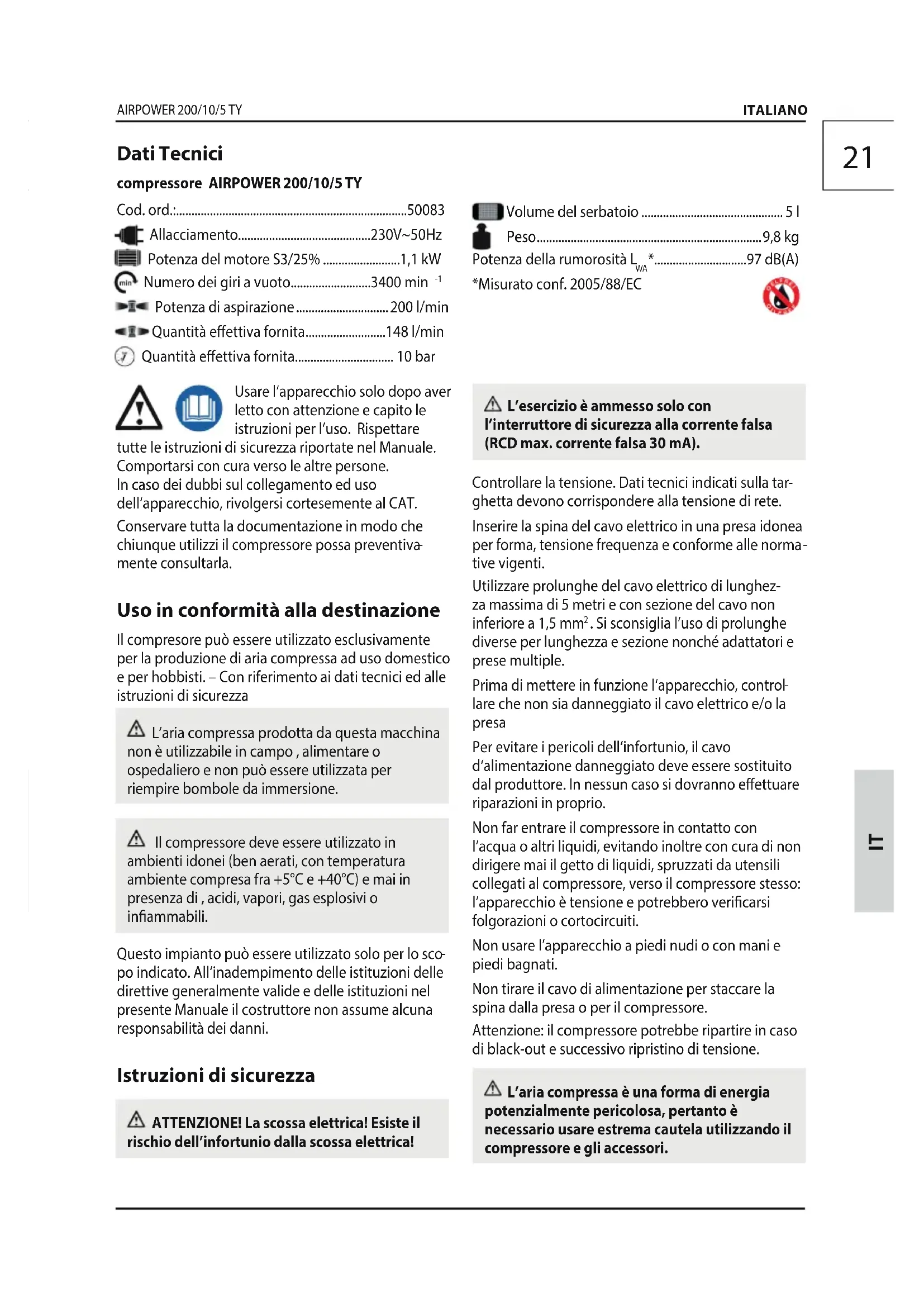 - po indicato. All‘inadempimento delle istituzioni delle direttive generalmente valide e delle istituzioni nel presente Manuale il costruttore non assume alcuna responsabilità dei danni. Istruzioni di sicurezza ATTENZIONE! La scossa elettrica! Esiste il rischio dell’infortunio dalla scossa elettrica! ITALIANO Dati Tecnici compressore AIRPOWER 200/10/5 TY Cod. ord.: p. 5008