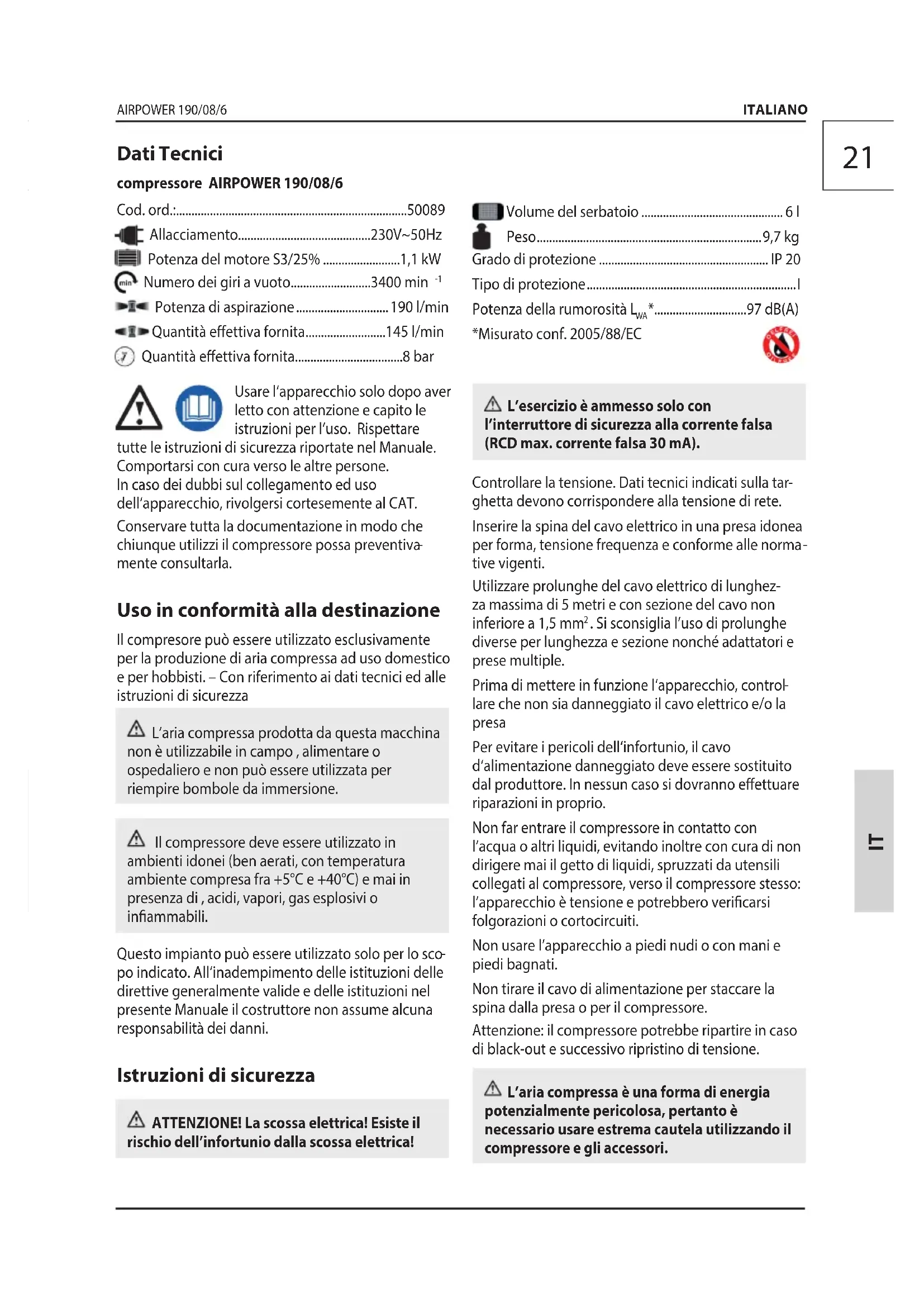 - po indicato. All‘inadempimento delle istituzioni delle direttive generalmente valide e delle istituzioni nel presente Manuale il costruttore non assume alcuna responsabilità dei danni. Istruzioni di sicurezza ATTENZIONE! La scossa elettrica! Esiste il rischio dell’infortunio dalla scossa elettrica! ITALIANO Dati Tecnici compressore AIRPOWER 190/08/6 Cod. ord.: p. 5008