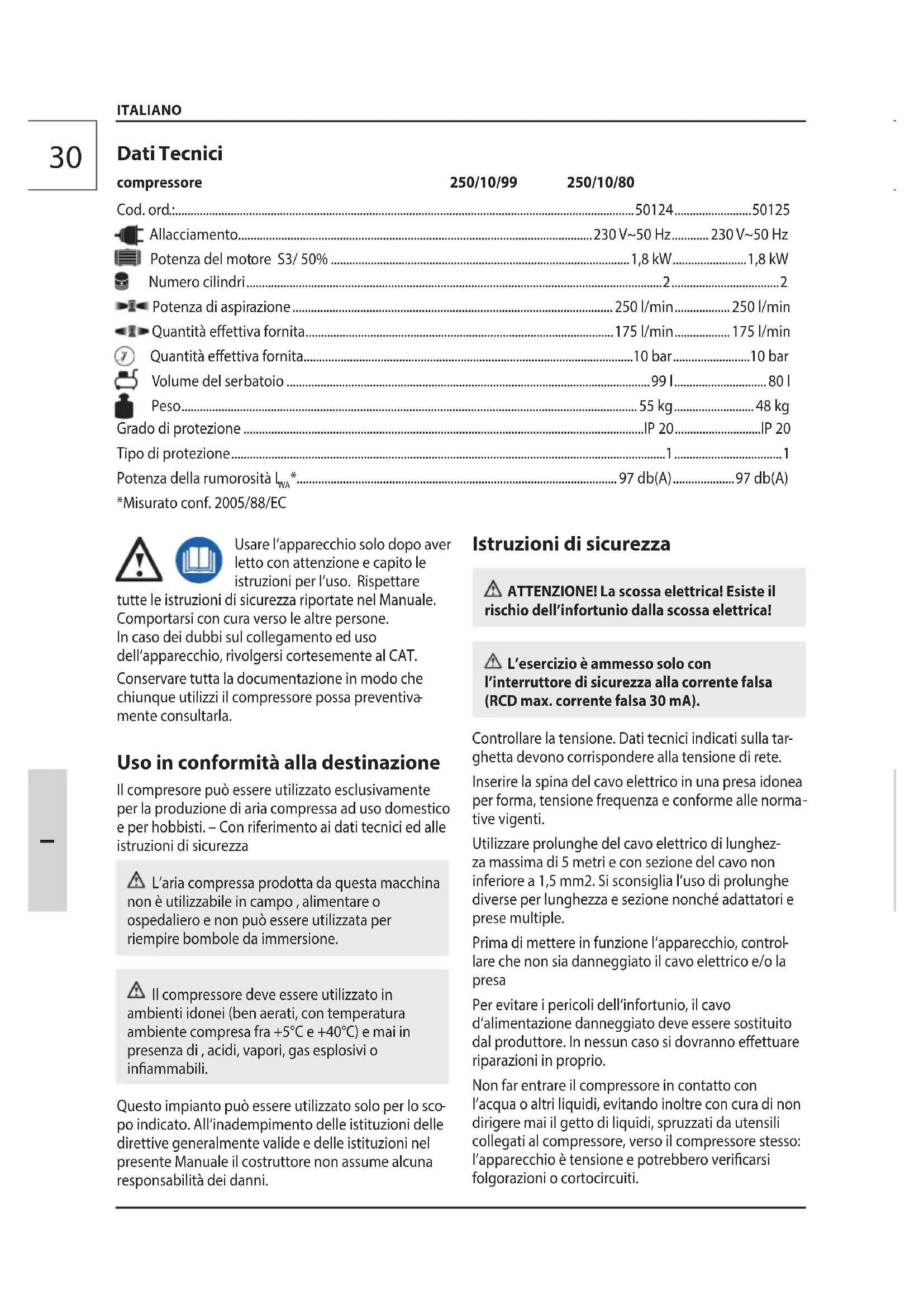 *........................................................................................................97 db(A) ....................97 db(A) *Misurato conf. 2005/88/EC Dati Tecnici compressore 250/10/99 250/10/8031 L’utilizzo dell’aria compressa nei diversi usi previsti (gonaggio, utensili pneumatici, verniciatura, lavaggio con detergenti solo a base acquosa, , ecc.) comporta la conoscenza ed il rispetto delle norme previste nei singoli casi. Questo compressore è costruito per funzionare con un rapporto di intermittenza specicato sulla targhetta dati tecnici, (ad esempio S3- 15 signica 1,5 minuti di lavoro e 8,5 minuti di fermata) onde evitare un eccessivo surriscaldamento del motore elettrico. Nel caso ciò si dovesse , interverrebbe la protezione termica di cui il motore è dotato interrompendo automaticamente la corrente elettrica quando la temperatura è troppo elevata. Al ritorno delle condizioni normali di temperatura il motore si riavvia automaticamente. Attenzione! Mai accendere oppure spegnere il compressore tramite la spina. Premere sempre l’interruttore a pressione. Non lasciare il compressore in marcia durante la notte perché può costituire la fonte del pericolo. Alla ne del giorno di lavoro spegnerlo con ON/OFF, scaricare il polmone e sconnettere il compressore dalla rete. Attenzione: l’acqua che si condensa, se non scaricata, può corrodere il serbatoio, limitandone la capacità e pregiudicandone la sicurezza. Non lasciare esposto l’apparecchio agli agenti atmos