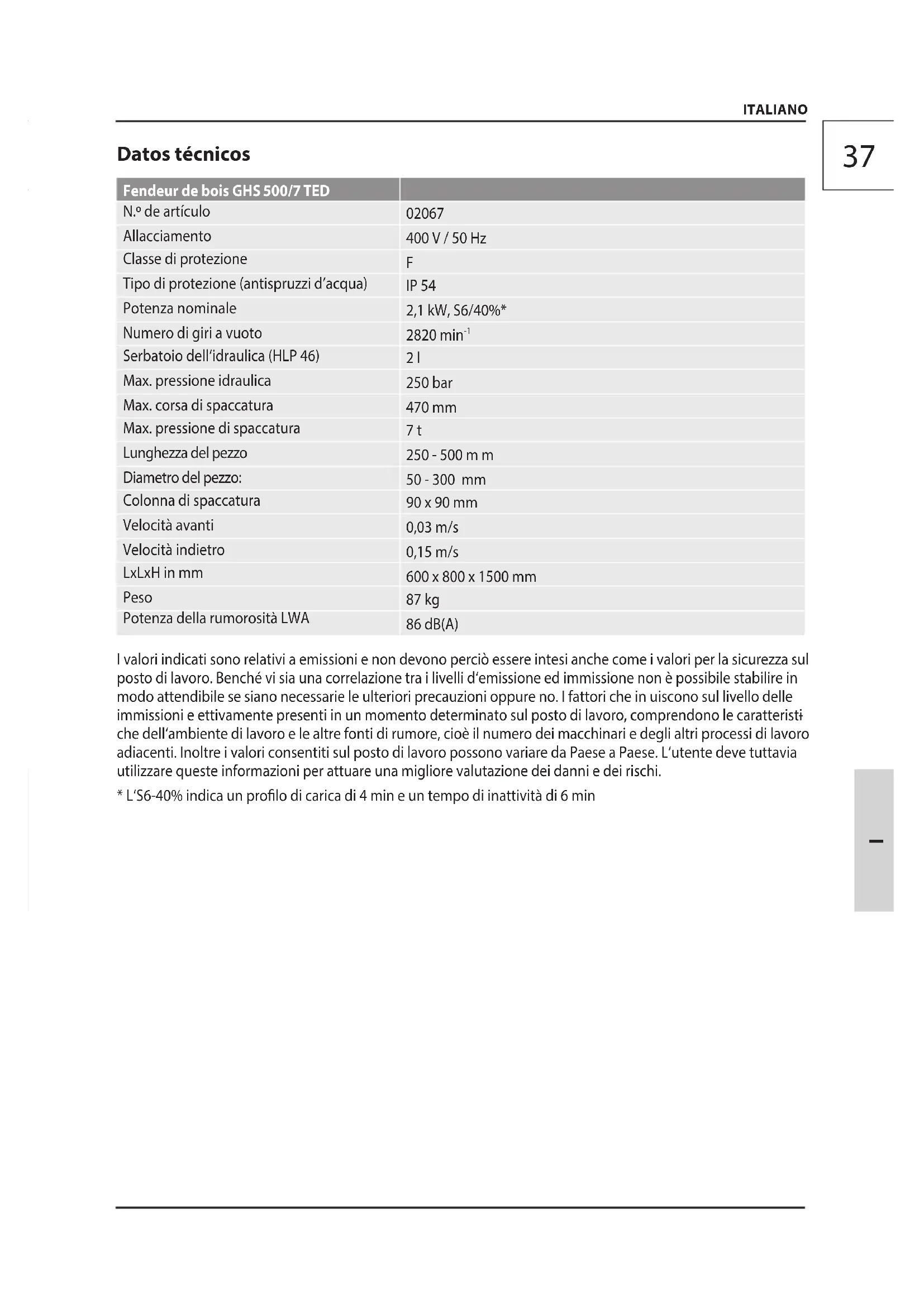 Colonna di spaccatura 90 x 90 mm Velocità avanti 0,03 m/s Velocità indietro 0,15 m/s LxLxH in mm 600 x 800 x 1500 mm Peso 87 kg Potenza della rumorosità LWA 86 dB(A) I valori indicati sono relativi a emissioni e non devono perciò essere intesi anche come i valori per la sicurezza sul posto di lavoro. Benché vi sia una correlazione tra i livelli d‘emissione ed immissione non è possibile stabilire in modo attendibile se siano necessarie le ulteriori precauzioni oppure no. I fattori che in uiscono sul livello delle immissioni e ettivamente presenti in un momento determinato sul posto di lavoro, comprendono le caratteristi