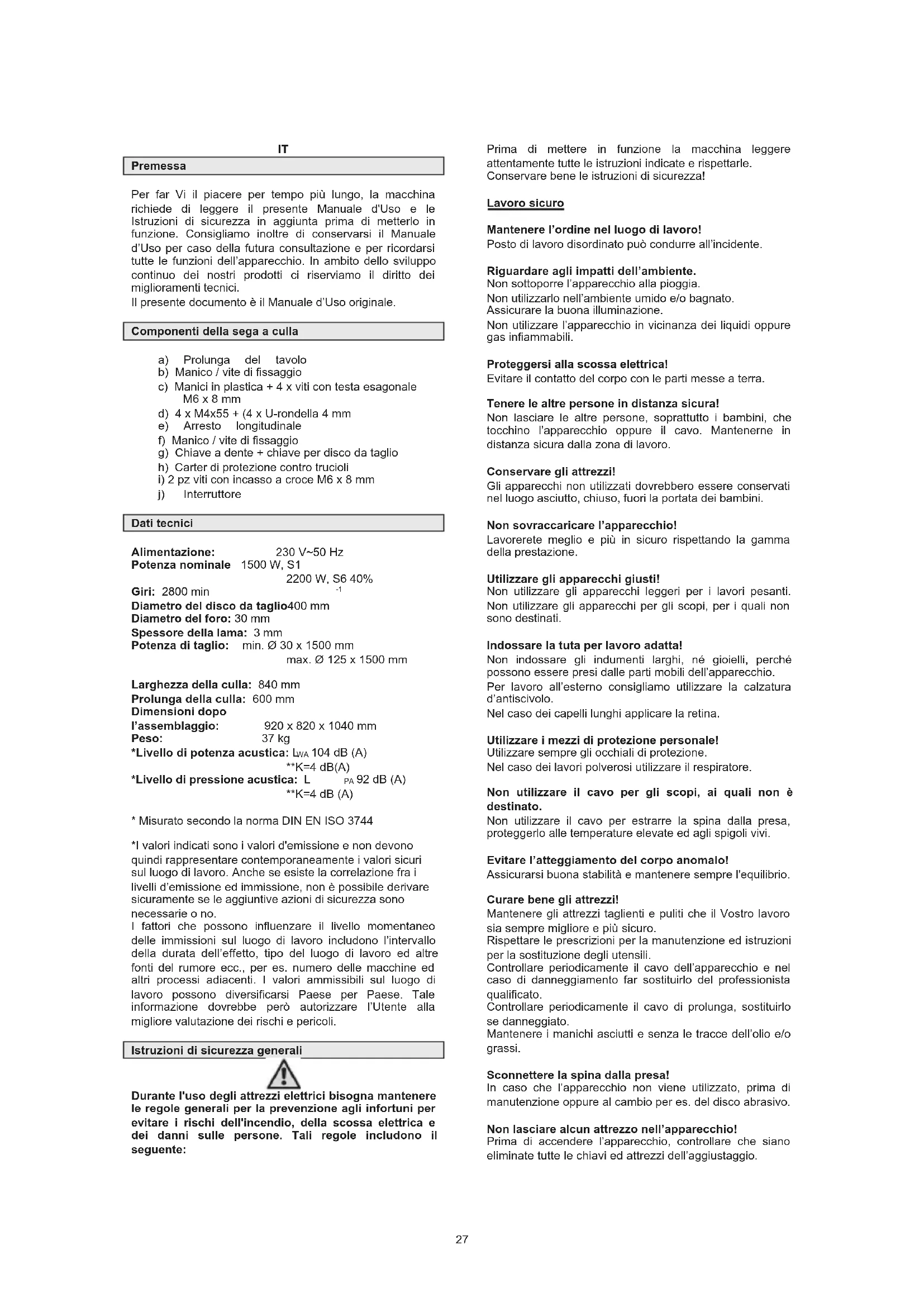 • Misurato secondo la norma DIN EN ISO 3744 *I valori indicati sono i valori d'emissione e non devono quindi rappresentare contemporaneamente i valori sicuri sul luogo di lavoro. Anche se esiste la correlazione fra i livelli d’emissione ed immissione, non è possibile derivare sicuramente se le aggiuntive azioni di sicurezza sono necessarie o no. I fattori che possono influenzare il livello momentaneo delle immissioni sul luogo di lavoro includono l’intervallo della durata dell’effetto, tipo del luogo di lavoro ed altre fonti del rumore ecc., per es. numero delle macchine ed altri processi adiacenti. I valori ammissibili sul luogo di lavoro possono diversificarsi Paese per Paese. Tale informazione dovrebbe però autorizzare l’Utente alla migliore valutazione dei rischi e pericoli. Istruzioni di sicurezza generali Durante l'uso degli attrezzi elettrici bisogna mantenere le regole generali per la prevenzione agli infortuni per evitare i rischi dell'incendio, della scossa elettrica e dei danni sulle persone. Tali regole includono il seguente: Prima di mettere in funzione la macchina leggere attentamente tutte le istruzioni indicate e rispettarle. Conservare bene le istruzioni di sicurezza! Lavoro sicuro Mantenere l’ordine nel luogo di lavoro! Posto di lavoro disordinato può condurre all’incidente. Riguardare agli impatti dell’ambiente. Non sottoporre l’apparecchio alla pioggia. Non utilizzarlo nell’ambiente umido e/o bagnato. Assicurare la buona illuminazione. Non utilizzare l’apparecchio in vicinanza dei liquidi oppure gas infiammabili. Proteggersi alla scossa elettrica! Evitare il contatto del corpo con le parti messe a terra. Tenere le altre persone in distanza sicura! Non lasciare le altre persone, soprattutto i bambini, che tocchino l’apparecchio oppure il cavo. Mantenerne in distanza sicura dalla zona di lavoro. Conservare gli attrezzi! Gli apparecchi non utilizzati dovrebbero essere conservati nel luogo asciutto, chiuso, fuori la portata dei bambini. Non sovraccaricare l’apparecchio! Lavorerete meglio e più in sicuro rispettando la gamma della prestazione. Utilizzare gli apparecchi giusti! Non utilizzare gli apparecchi leggeri per i lavori pesanti. Non utilizzare gli apparecchi per gli scopi, per i quali non sono destinati. Indossare la tuta per lavoro adatta! Non indossare gli indumenti larghi, né gioielli, perché possono essere presi dalle parti mobili dell’apparecchio. Per lavoro all’esterno consigliamo utilizzare la calzatura d’antiscivolo. Nel caso dei capelli lunghi applicare la retina. Utilizzare i mezzi di protezione personale! Utilizzare sempre gli occhiali di protezione. Nel caso dei lavori polverosi utilizzare il respiratore. Non utilizzare il cavo per gli scopi, ai quali non è destinato. Non utilizzare il cavo per estrarre la spina dalla presa, proteggerlo alle temperature elevate ed agli spigoli vivi. Evitare l’atteggiamento del corpo anomalo! Assicurarsi buona stabilità e mantenere sempre l'equilibrio. Curare bene gli attrezzi! Mantenere gli attrezzi taglienti e puliti che il Vostro lavoro sia sempre migliore e più sicuro. Rispettare le prescrizioni per la manutenzione ed istruzioni per la sostituzione degli utensili. Controllare periodicamente il cavo dell’apparecchio e nel caso di danneggiamento far sostituirlo del professionista qualificato. Controllare periodicamente il cavo di prolunga, sostituirlo se danneggiato. Mantenere i manichi asciutti e senza le tracce dell’olio e/o grassi. Sconnettere la spina dalla presa! In caso che l’apparecchio non viene utilizzato, prima di manutenzione oppure al cambio per es. del disco abrasivo. Non lasciare alcun attrezzo nell’apparecchio! Prima di accendere l’apparecchio, controllare che siano eliminate tutte le chiavi ed attrezzi dell’aggiustaggio. 27Evitare l’accensione involontaria dell'apparecchio! Connettendo la spina alla presa, accertarsi che l’interruttore sia disattivato. Cavi di prolunga all’esterno: All’esterno utilizzare solo i cavi di prolunga approvati, con la corrispondente identificazione. Porre l’attenzione! Porre attenzione a ciò, che state facendo. Lavorando, comportarsi razionalmente. Non utilizzare l’apparecchio, quando siete stanchi. Controllare che l’attrezzo non sia danneggiato in qualche modo! Prima dell’uso successivo dell’apparecchio occorre ispezionare accuratamente i dispositivi di protezione e le parti leggermente danneggiate, se funzionano ancora perfettamente. Controllare che le parti mobili funzionano perfettamente, non si bloccano e non sono danneggiate. Tutte le parti devono essere montate in modo giusto e devono soddisfare tutte le condizioni per garantire perfetto l’esercizio della macchina. Dispositivi di protezione danneggiati etc., devono essere riparati oppure sostituiti presso le officine autorizzate, se nel Manuale non è indicato diversamente nel modo univoco. Far sostituire gli interruttori presso l’officina autorizzata. Non utilizzare gli apparecchi con interruttore non funzionante. AMMONIMENTO! Applicazione degli utensili ed accessori diversi da quelli originali può condurre al ferimento della Vostra persona. Far riparare l’apparecchio solo dagli esperti del settore elettrico! Questo apparecchio è conforme alle relative istituzioni di sicurezza. Le riparazioni possono essere svolte solo dagli elettricisti qualificati che utilizzeranno i ricambi originali, altrimenti potrebbe avvenire l’infortunio dell’Utente. Istruzioni di sicurezza particolari x Mantenere gli attrezzi taglienti e puliti – il Vostro lavoro sarà poi più sicuro. x Lavorare razionalmente. Non utilizzare l’apparecchio, quando siete stanchi. x Attenzione! Il disco da taglio in rotazione rappresenta il pericolo del ferimento per le Vostre mani e dita! x L’apparecchio è dotato dell’interruttore d’emergenza contro l'accensione dopo salto della tensione. x Quando avete bisogno del cavo di prolunga, accertarsi che la sua sezione è 